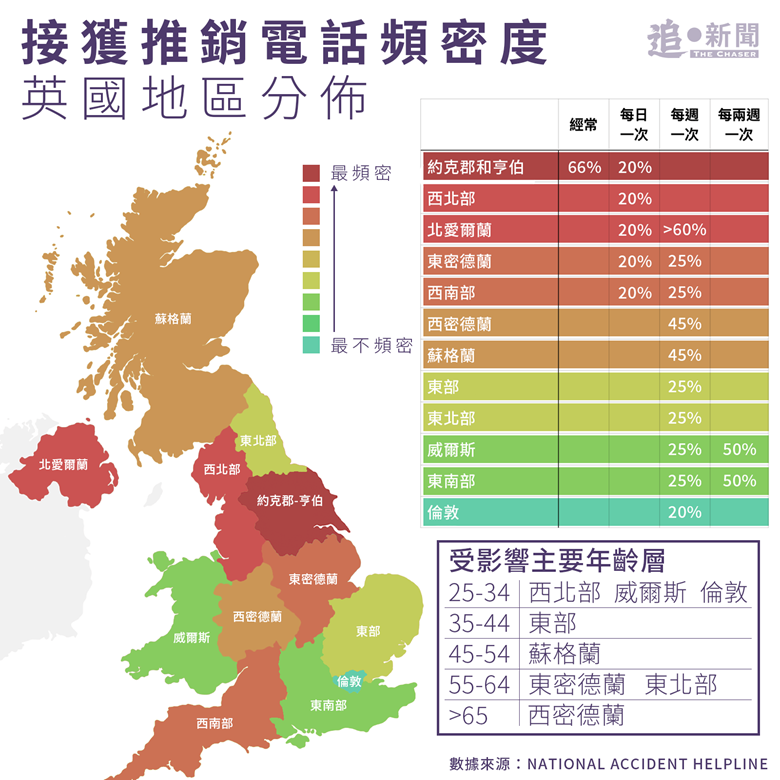 圖解DATA / 2022 年 7 月 17 日 圖解DATA|中部地區接最多推銷電話 可登記英版「拒收訊息登記冊」減低騷擾 文字:《追新聞》記者 圖解DATA 推銷電話好滋擾!根據英國個人諮詢公司National Accident Helpline網頁顯示,約克郡及亨伯地區居民接獲最多推銷電話,66%人表示頻率多於每日一次;北愛爾蘭、西北部、西南部及東密德蘭均有五分一人表示每日接獲推銷電話。年齡層分佈分面,最受影響的年齡層屬25-34歲青年,其次為55歲以上退休年齡組別。 slide 1 slide 2 標籤: 推銷電話, 電話滋擾 一齊撐起《追新聞》 訂閱《追新聞》Patreon 支持,閱讀所有「追・新聞」、「追・專題」以及「追・專欄」的全部報道內容,有賴讀者付費月訂或年訂支持營運。 訂閱支持