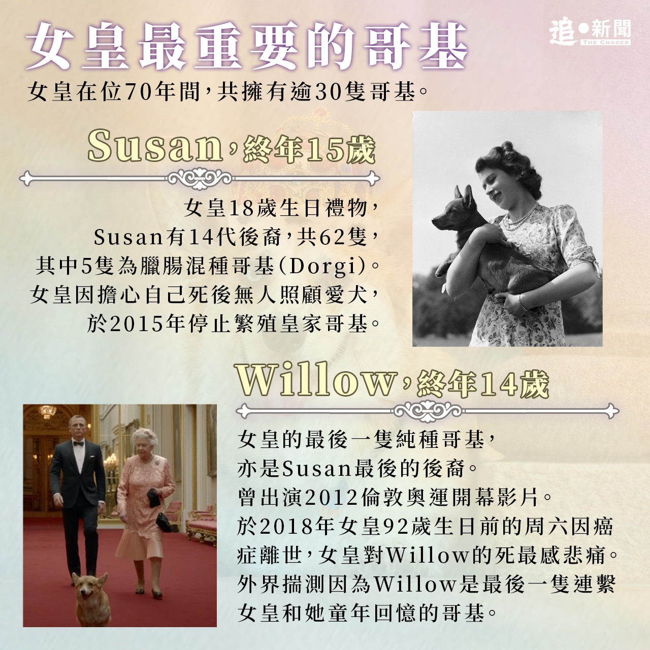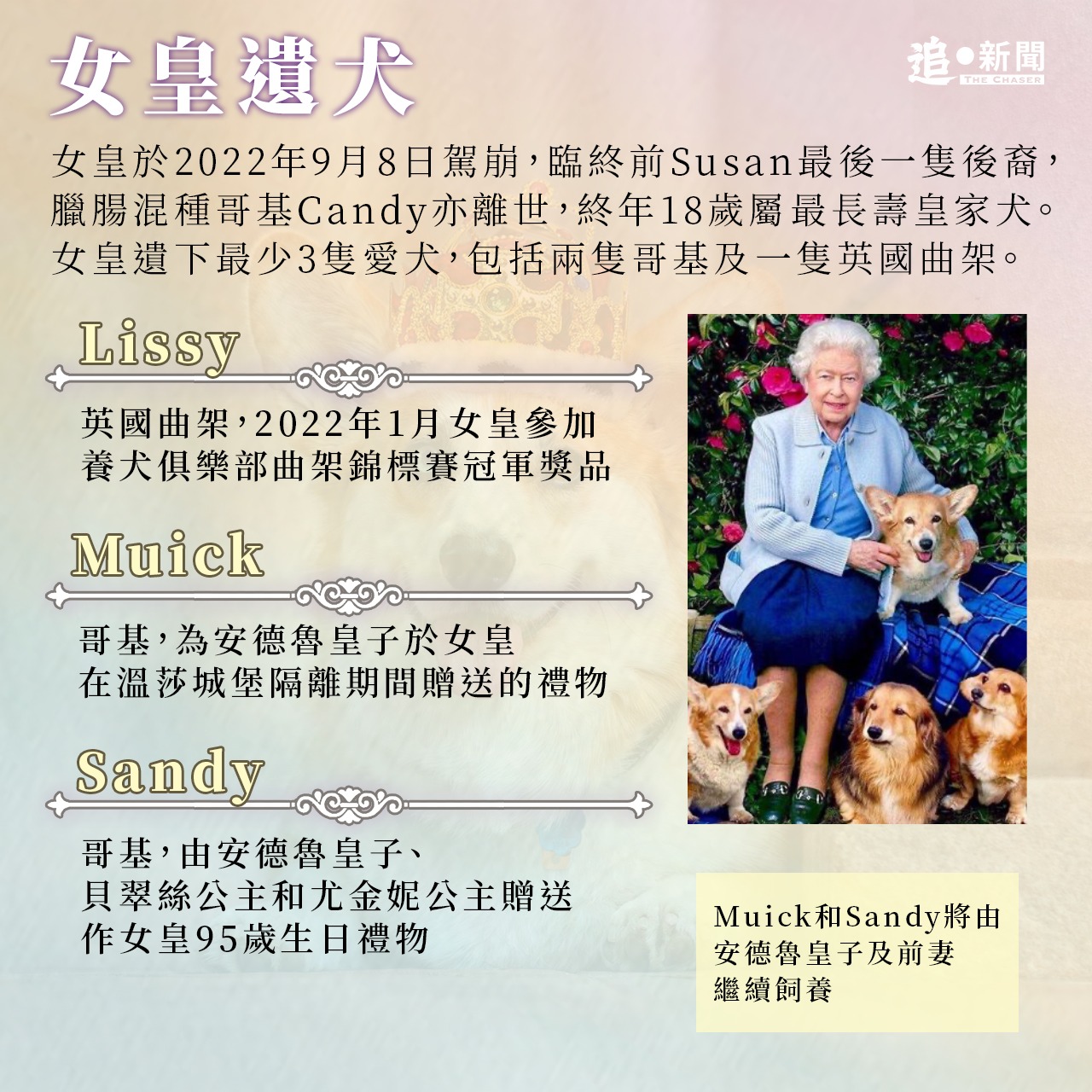 Candy,以18歲高壽離世,為目前温莎王朝最長壽的皇家犬。女皇駕崩前再受喪犬之痛,Susan最後的血脈,臘腸混種哥基(Dorgi)人們總說「狗的一生只有主人」,女皇一生也充滿了哥基,願女皇在天上與哥基們重逢。