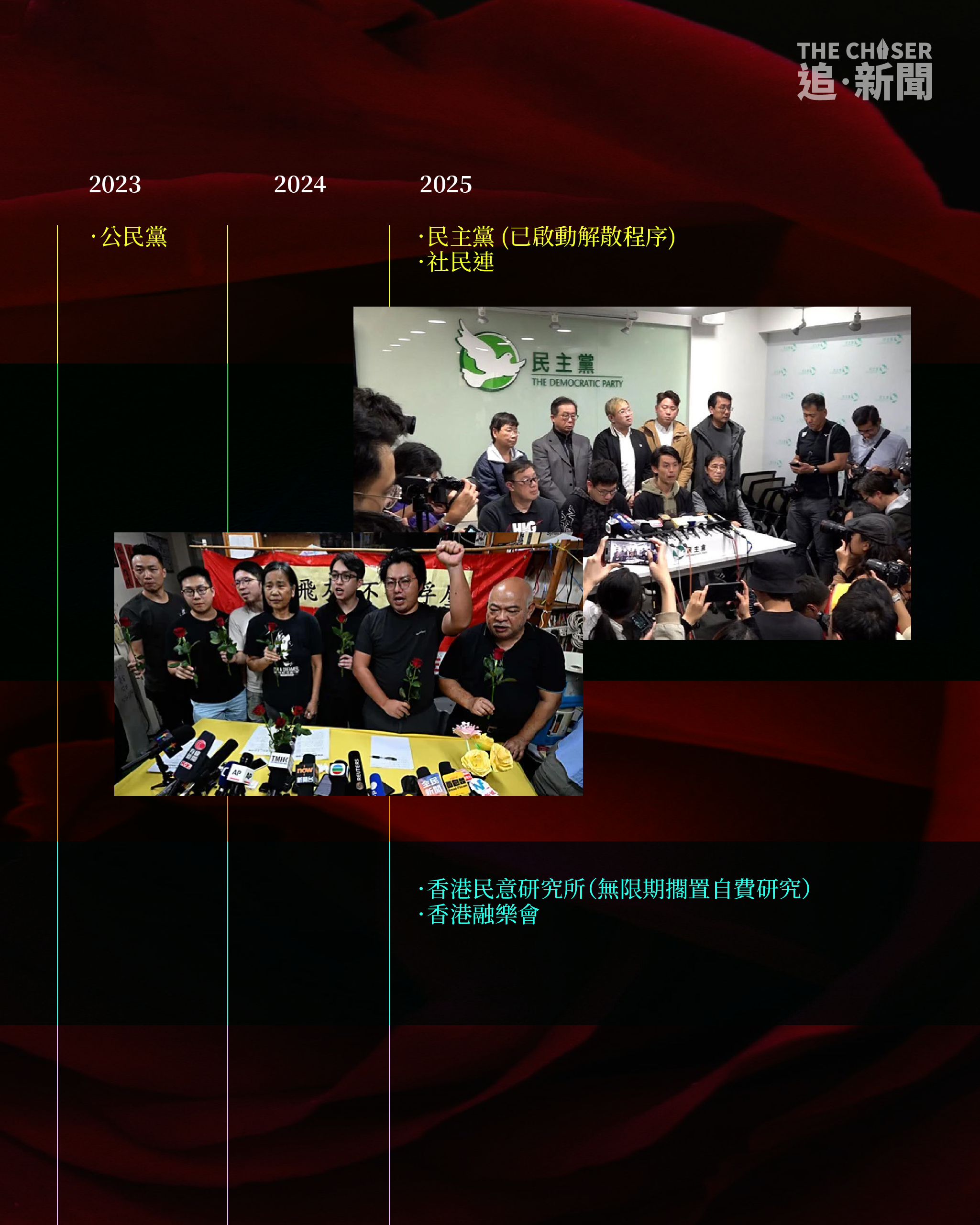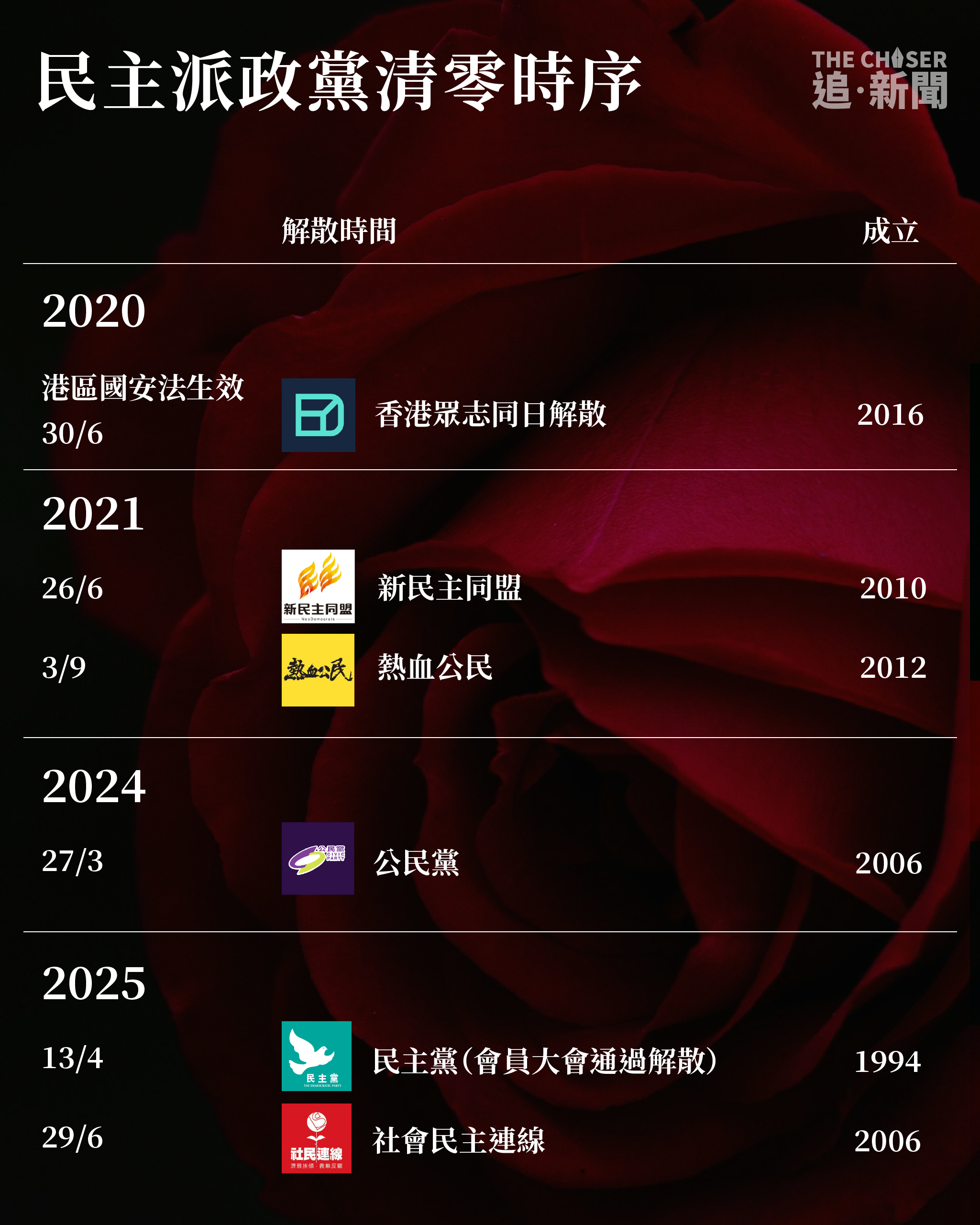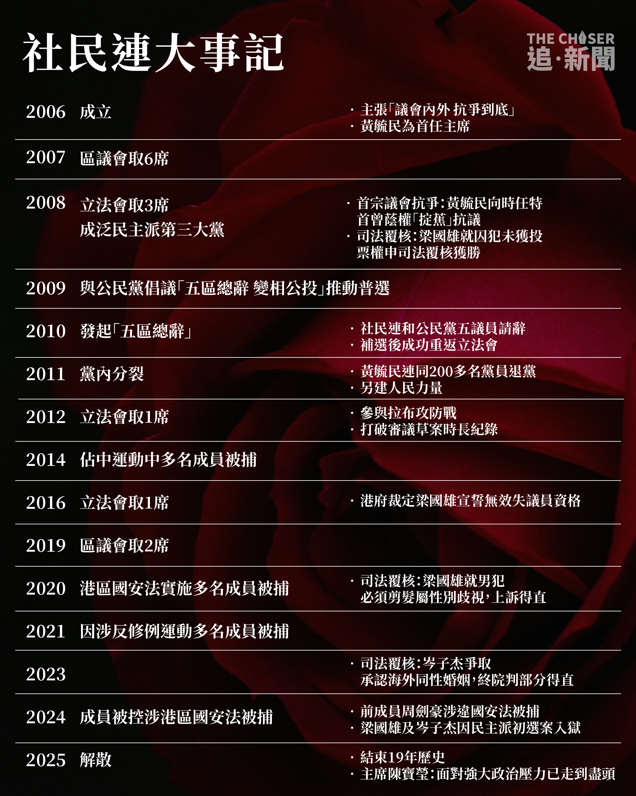 成立19年的社民連上周在7.1前夕宣佈解散,標記着香港泛民主派政黨正式清零。社民連自成立以來一直以「議會內外,抗爭到底」為口號,曾被視為「激進民主派」,並長期推動雙普選等政治議題,其成員多次在社運事件中被捕,標誌性行動包括每年7.1遊行抬棺材抗議。