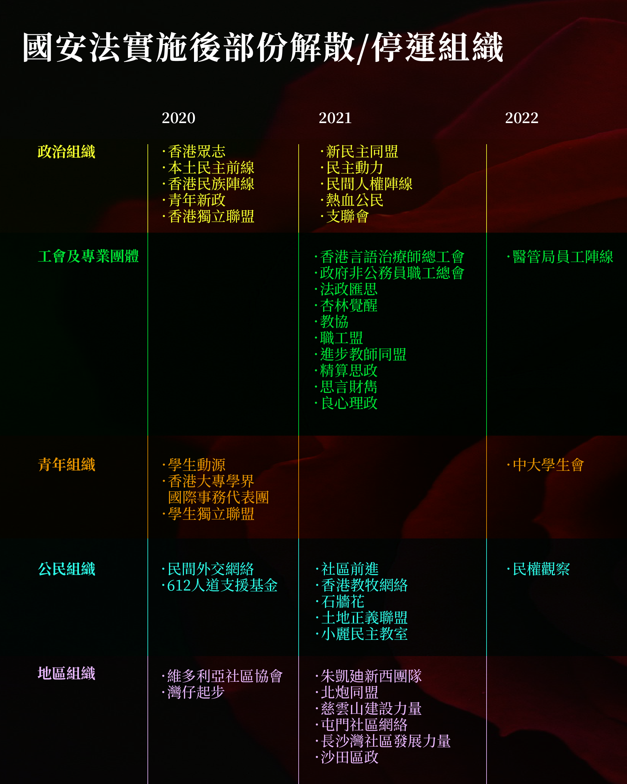 根據美國喬治城大學亞洲法中心去年發表的報告顯示,自2020年國安法實施至2023年底,香港已有超過90個組織或團體解散。