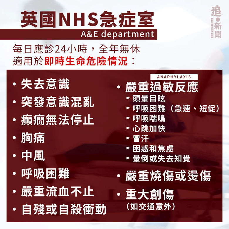 初來報到突然頭暈身㷫點算好?英國人口越來越多,緊急服務前線工作更趨繃緊。根據英國下議院圖書館公佈《2022年6月NHS重點數據》顯示,NHS醫護人手持續增加,但急症室輪候時間越來越長。大家避免逼爆A&E,可選擇在非即時生命危險情況善用非緊急求助服務,包括NHS緊急治療中心和111熱線,以及非緊急報警熱線101,紓緩醫療前線的壓力。