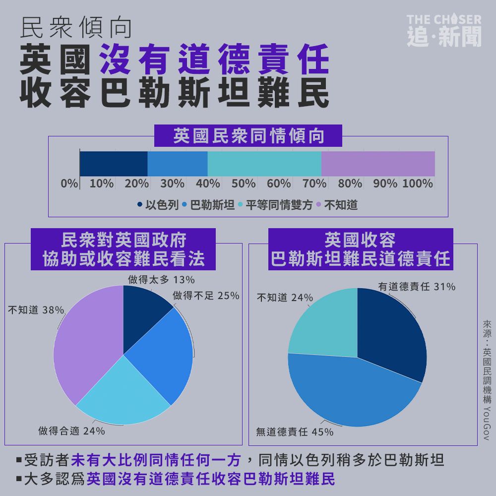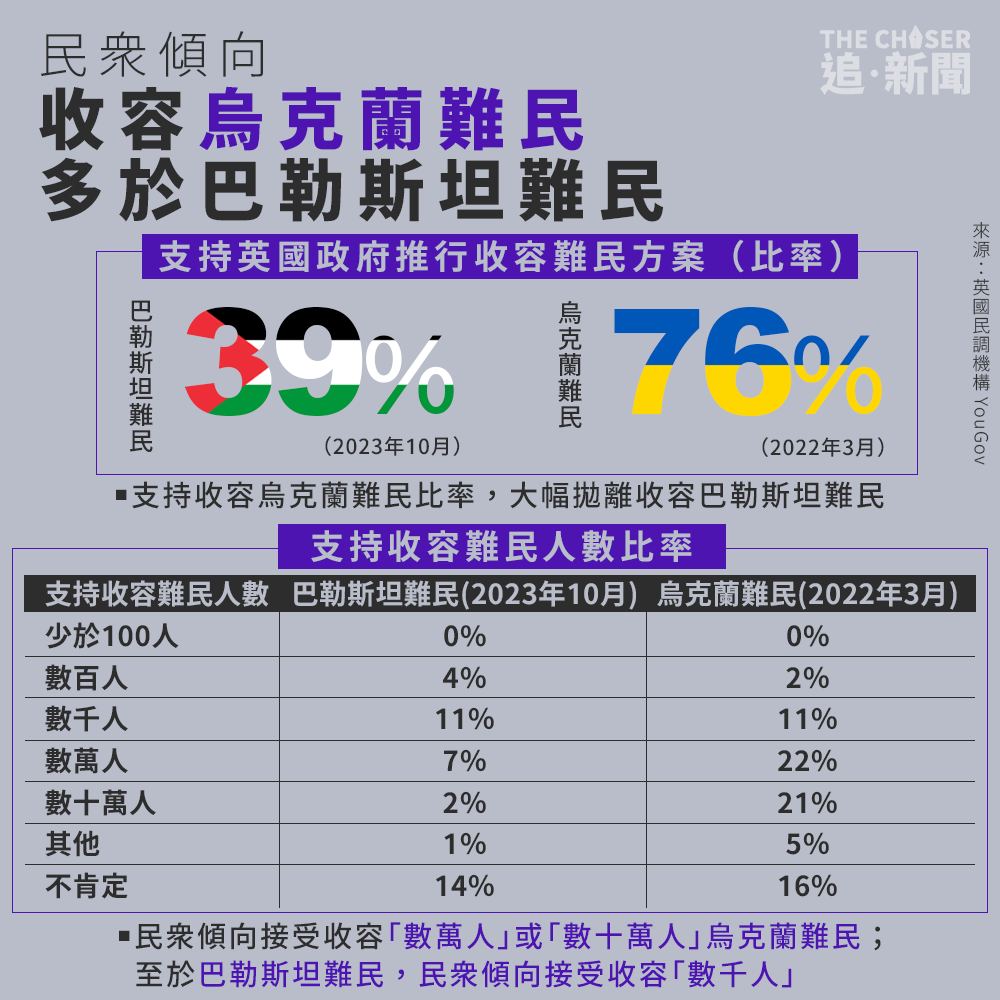 英國民調機構YouGov訪問民眾對收容難民的看法,結果大部份認為英國沒有道德責任收容巴勒斯坦難民。相比之下,民眾更傾向支持政府收容烏克蘭難民。
