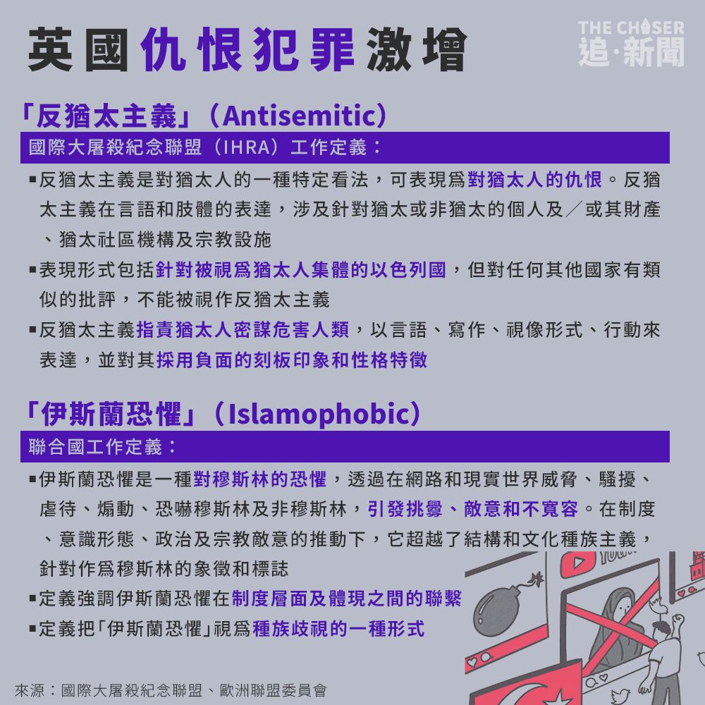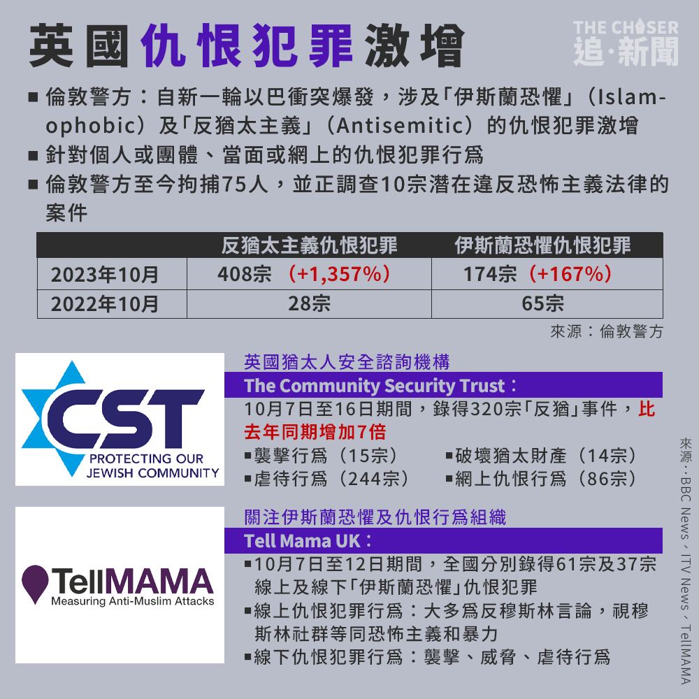 另外,以巴衝突亦令西方各國社群之間的矛盾加劇。英國倫敦警方表示,自新一輪以巴衝突爆發以來,涉及「伊斯蘭恐懼」(Islamophobic)及「反猶太主義」(Antisemitic)的仇恨犯罪激增。「反猶太主義仇恨犯罪」及「伊斯蘭恐懼仇恨犯罪」的個案分別比去年同期大增1,357%及167%,當中涉及襲擊、破壞猶太財產、網上仇恨言論等行為。