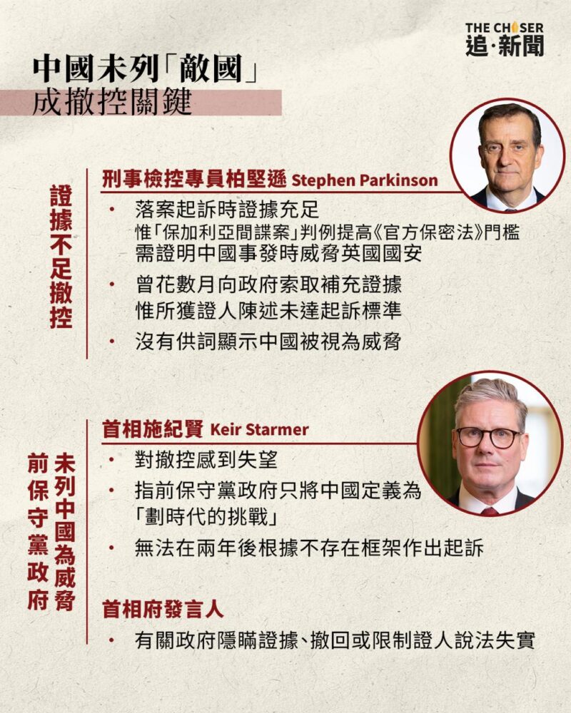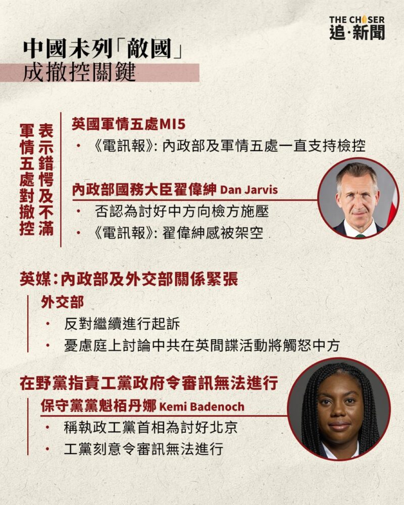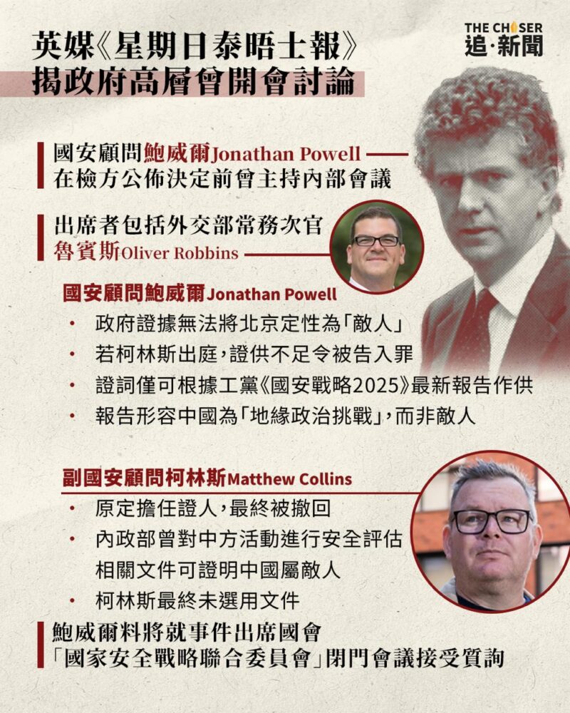 兩名被指為中方從事間諜活動的英國男子,早前被皇家檢控署(CPS)以證據不足為由撤銷控罪,震撼英國政壇。刑事檢控專員柏堅遜(Stephen Parkinson)表示曾向政府索取所需證據不果。撤控關鍵是因為政府未有將中國定性為「敵國」,英媒連日來不斷披露多個政府部門及官員在案件中的角色,焦點落在國安顧問鮑威爾(Jonathan Powell)身上。事件亦揭露工黨政府內部不和,內政部一直支持檢控,但外交部因擔心觸怒中方而反對起訴。