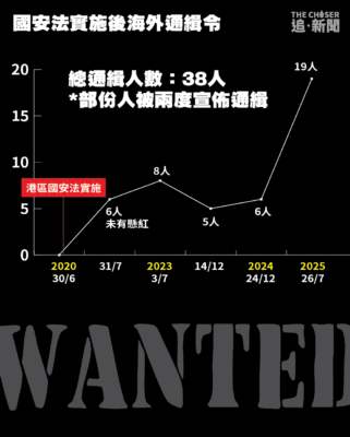 港府近日再次引用「港區國安法」,宣佈新一輪針對海外港人的懸紅通緝行動,令全球通緝名單總人數增至38人,當中大多數人被懸紅20萬至100萬港元不等。自名單公佈以來,至少有12名被通緝者在香港的親友被國安人員帶走調查。其中,香港民主委員會(HKDC)執行總監郭鳳儀的父親,早前被控以「處理潛逃者財產」罪名,成為首宗被檢控的通緝者家屬案例。