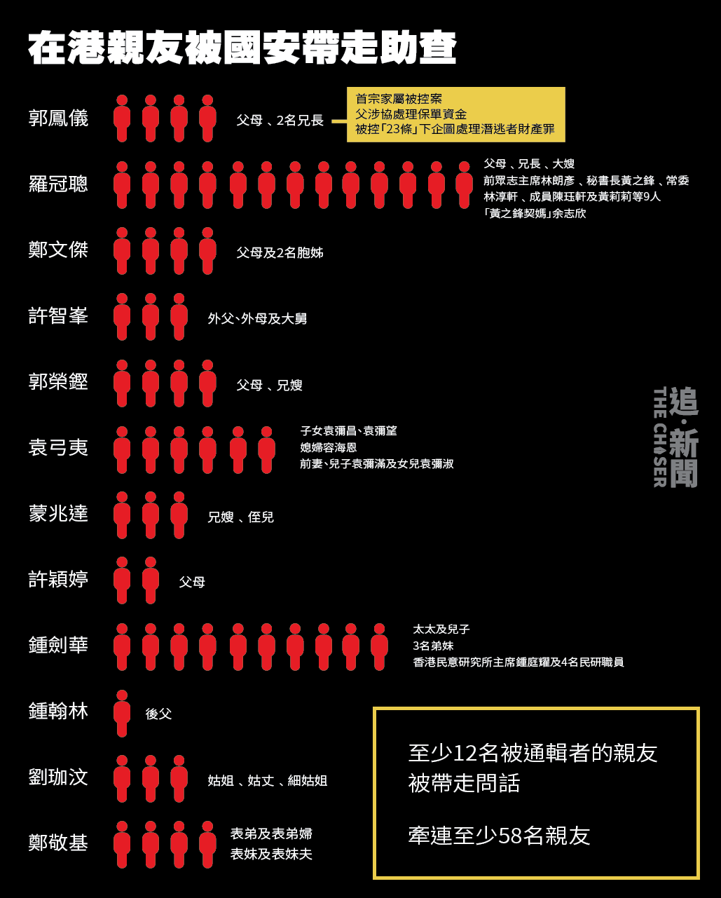 港府近日再次引用「港區國安法」,宣佈新一輪針對海外港人的懸紅通緝行動,令全球通緝名單總人數增至38人,當中大多數人被懸紅20萬至100萬港元不等。自名單公佈以來,至少有12名被通緝者在香港的親友被國安人員帶走調查。其中,香港民主委員會(HKDC)執行總監郭鳳儀的父親,早前被控以「處理潛逃者財產」罪名,成為首宗被檢控的通緝者家屬案例。