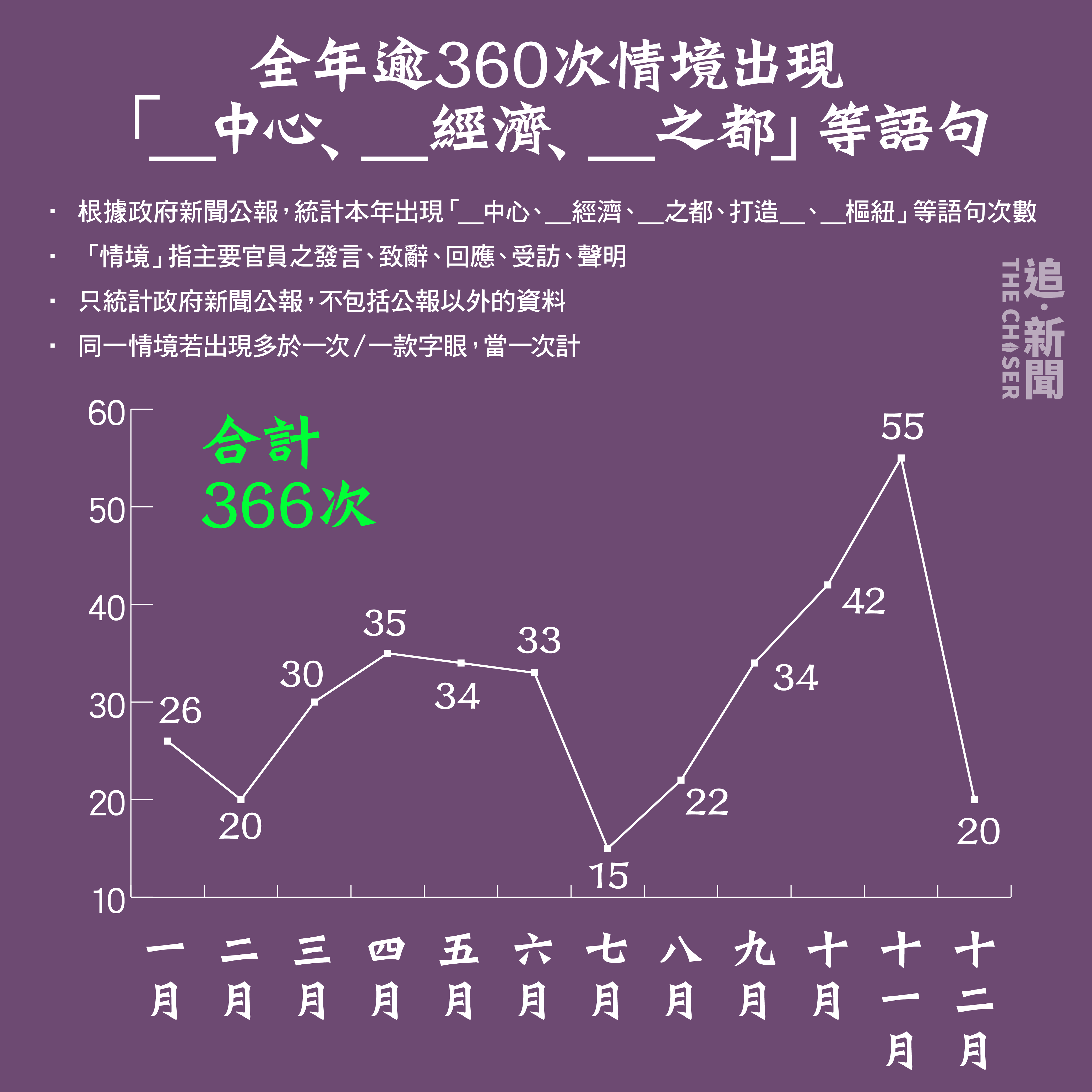 本欄目統計今年截至12月中的政府新聞公報、主要官員的發言、致辭等,發現有超過360次情境出現「中心」、「經濟」、「之都」等各類變化字眼。統計未有包括官方新聞公報以外的資料,若然把其他場合計算在內,相信次數更多。