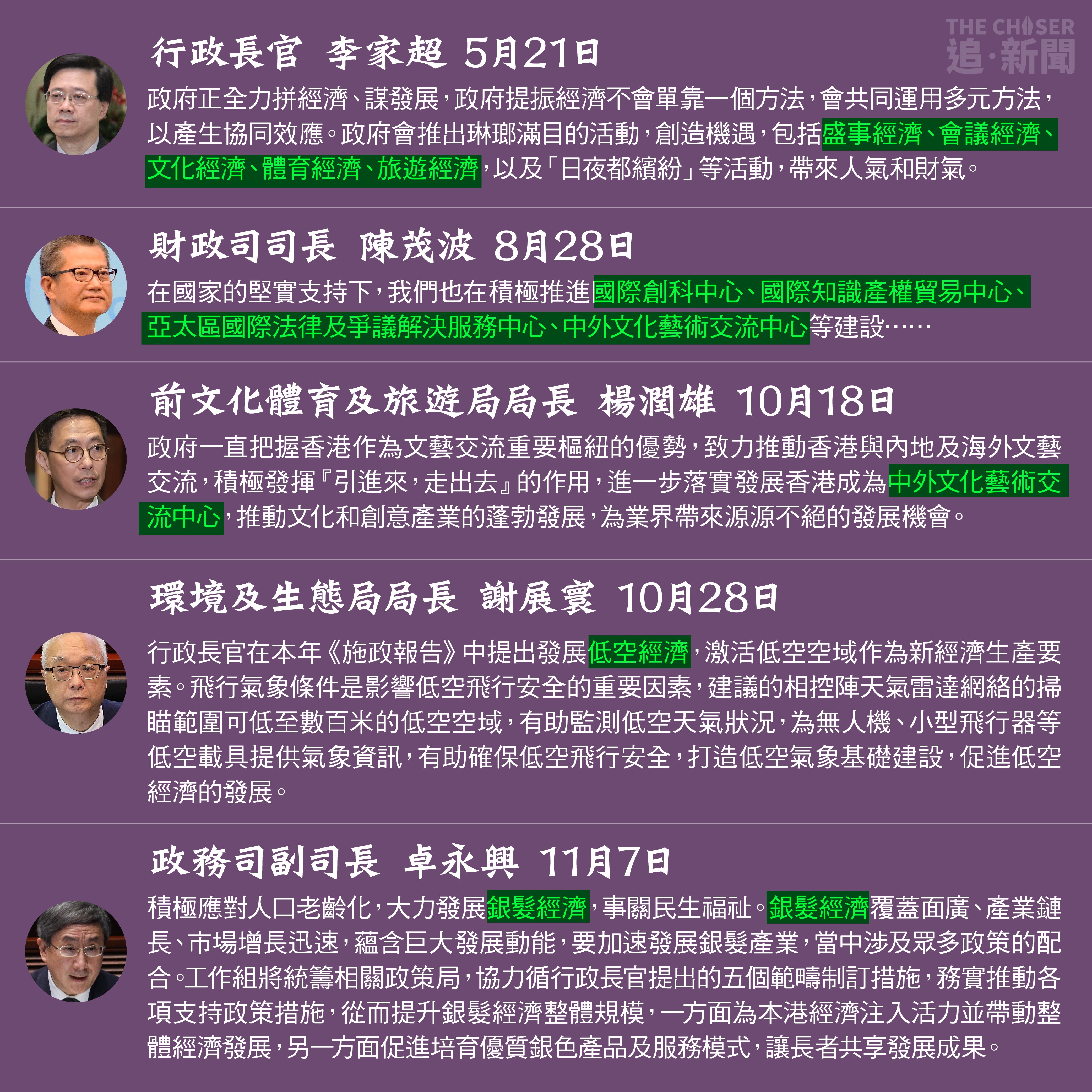 網民也留意到政府或官員頻繁使用「八大中心」、「中外文化交流中心」、「國際創科中心」、「香港慈善中心」、「低空經濟」、「國際教育樞紐」等字眼。