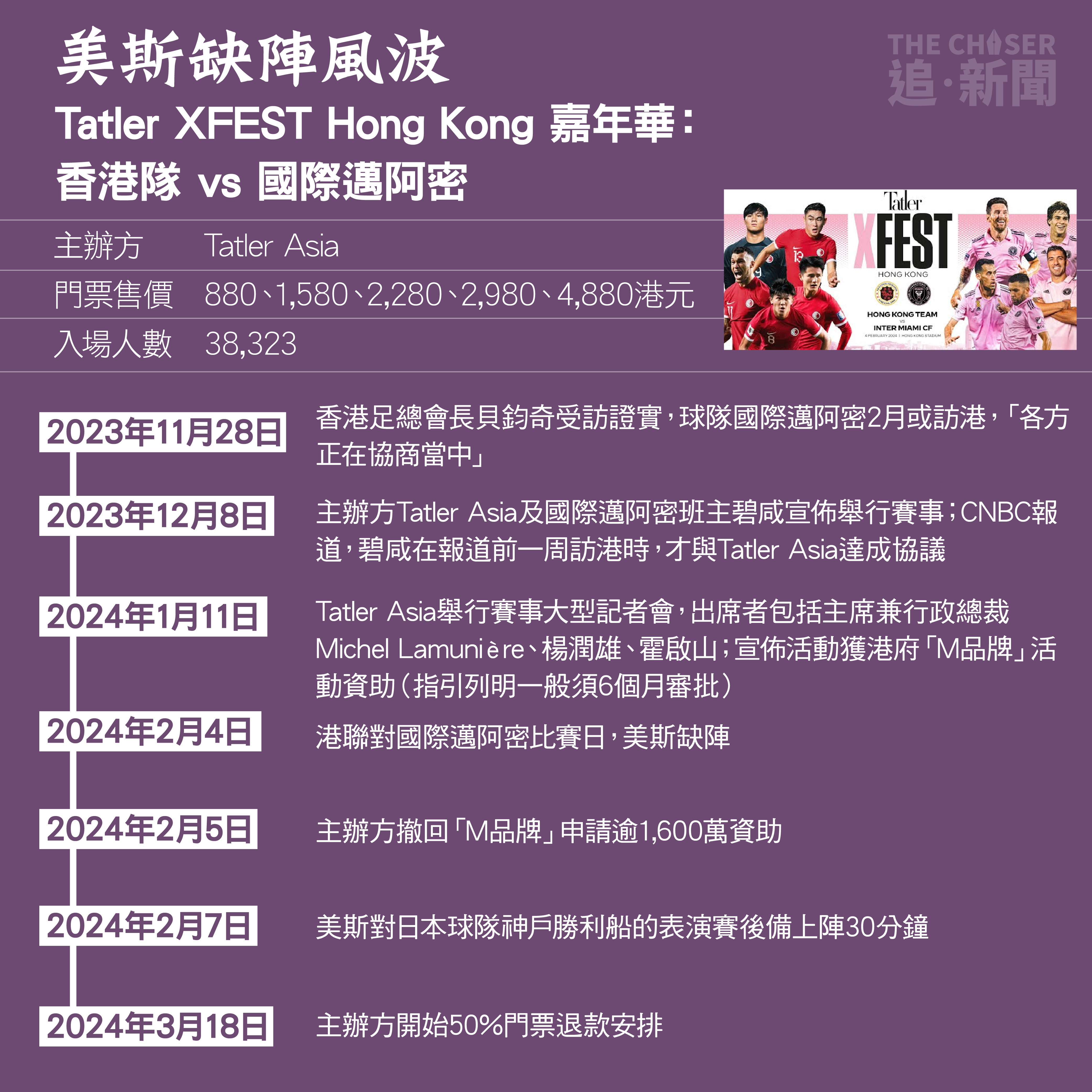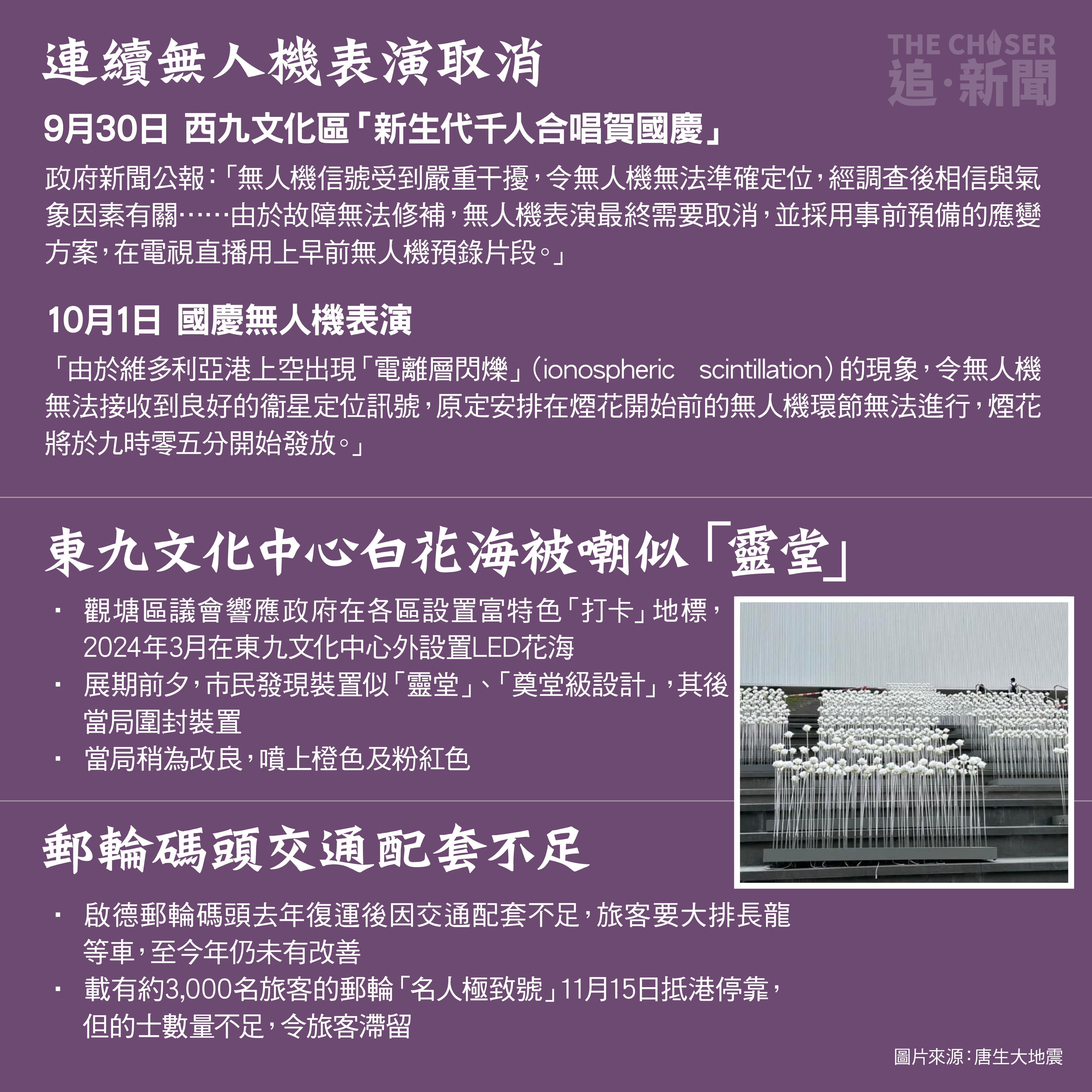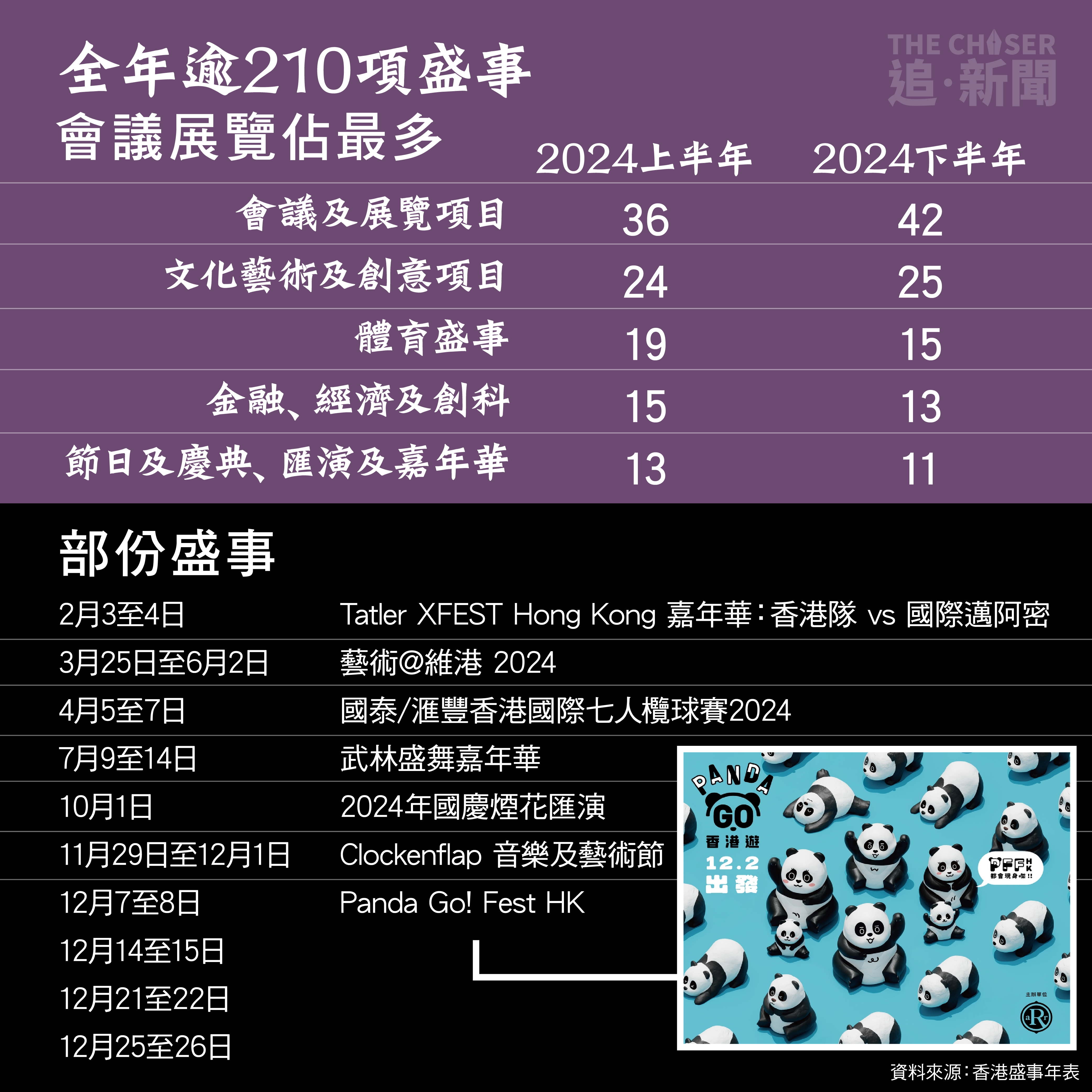 港府近年以「盛事之都」概念谷經濟,繼2023年連串「夜繽紛」,今年繼續宣揚從展覽、文化、體育到嘉年華等各類活動。回顧過去一年,不少活動出現甩轆或公關災難,例如球王美斯缺陣風波、國慶無人機表演取消事件。