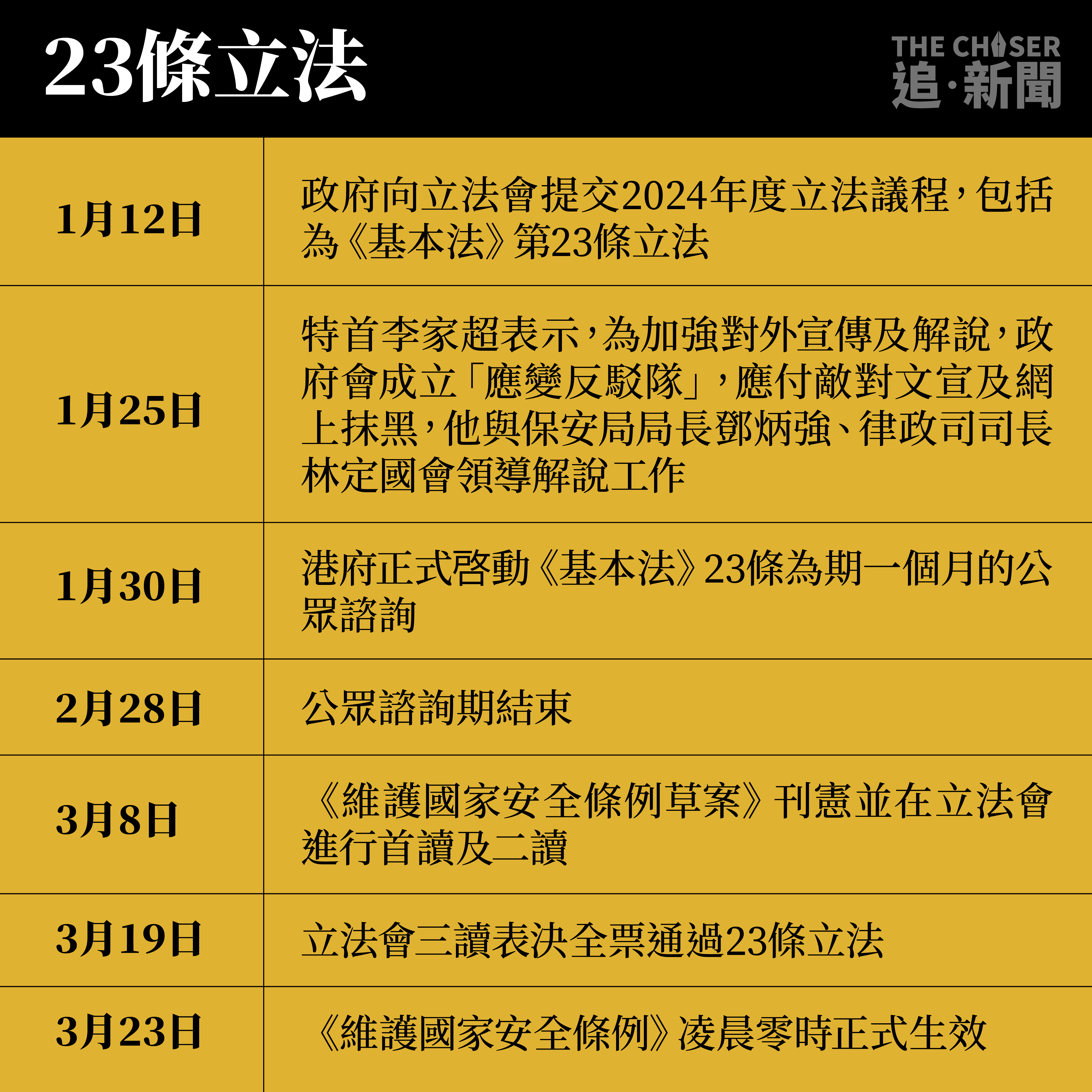 2024年即將完結,回顧過去一年的香港重要事件,當中包括輾轉談及多年的《基本法》23條立法,由1月底展開諮詢期,到3月19日迅速通過,3月23日正式生效。