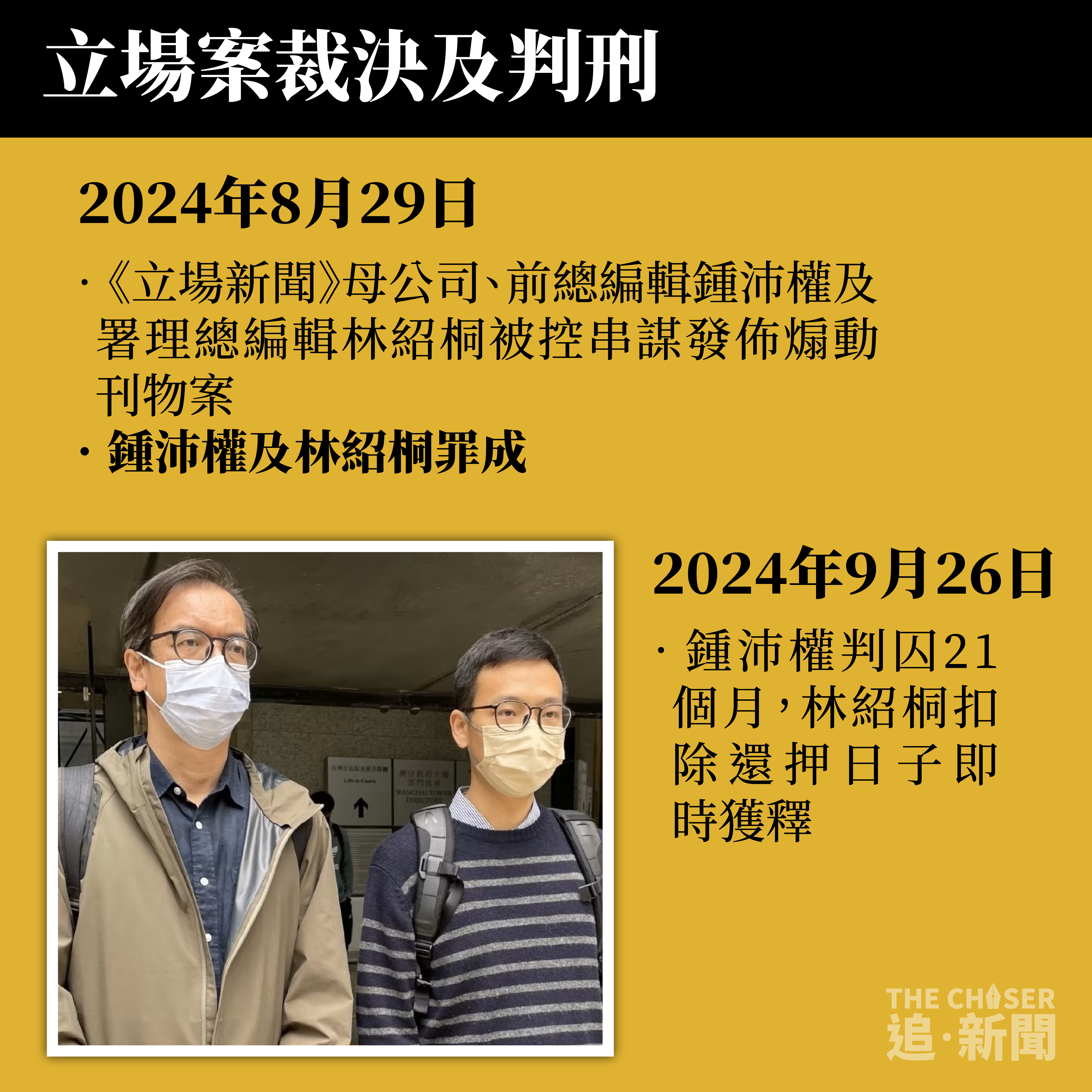 至於備受關注的政治案件亦在今年裁決及判刑,《立場新聞》案前總編輯鍾沛權及署理總編輯林紹桐被控串謀發佈煽動刊物案,兩人8月被判罪成,鍾沛權判囚21個月,林紹桐扣除還押日子即時獲釋。
