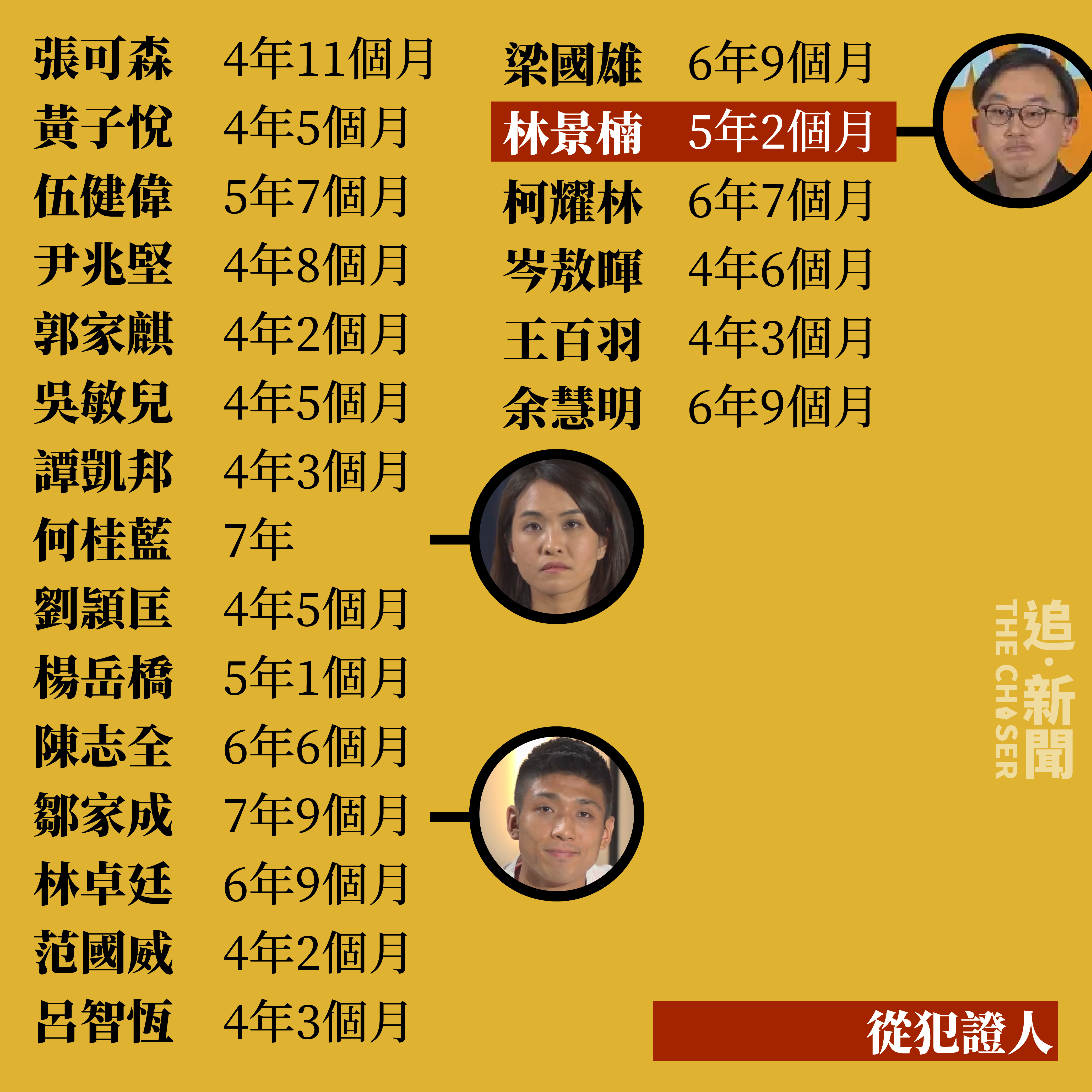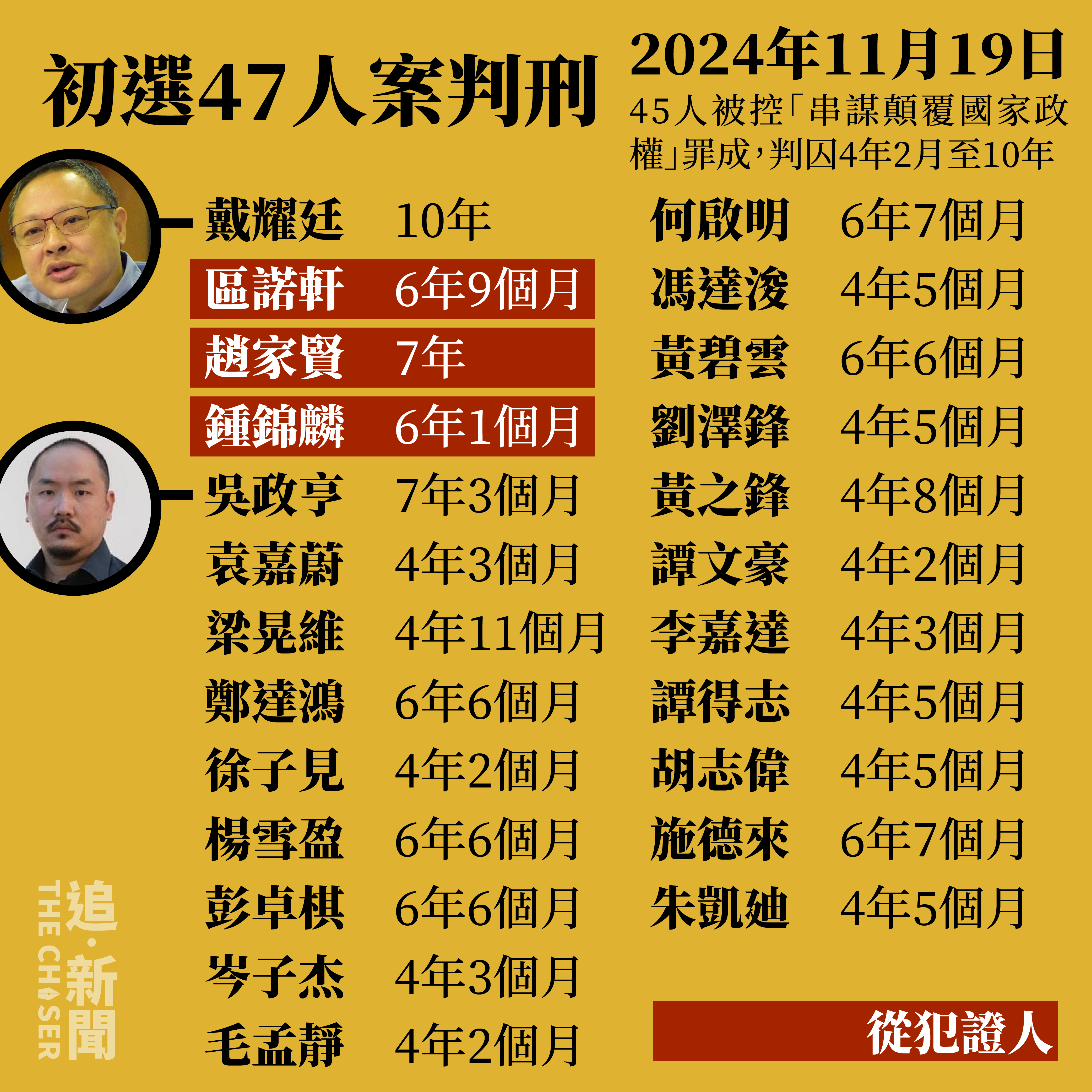 另外民主派初選47人案,45人被控「串謀顛覆國家政權」罪成,分別判囚4年2個月至10年不等,包括戴耀廷判囚10年、有份發起〈墨落無悔〉的定罪求情被告、前區議員鄒家成;以及拒絕認罪及求情的「立場姐姐」何桂藍,分別被重判7年9個月及7年。