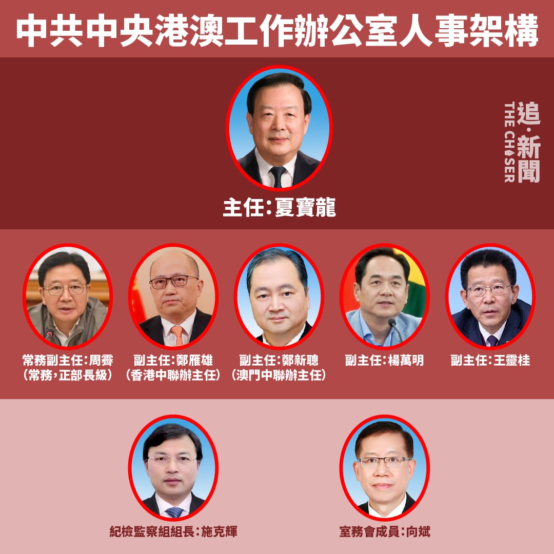 中共中央港澳辦正式埋班後,現年70歲、早已「超齡」的夏寶龍,因推動《港區國安法》、落實「愛國者治港」立下「大功」,得以「擔正」成為首任主任,繼續主理港澳辦的工作,而旗下的副手就有常務副主任周霽、香港中聯辦主任鄭雁雄、澳門中聯辦主任鄭新聰、楊萬明和王零桂,另外中央紀檢委國家監委駐中央港澳辦紀檢監察組組長施克輝,以及中央港澳辦室務會成員向斌亦在會議中列席。