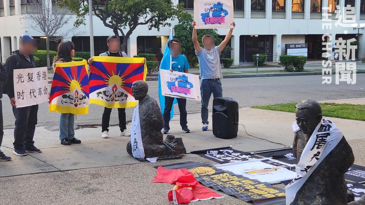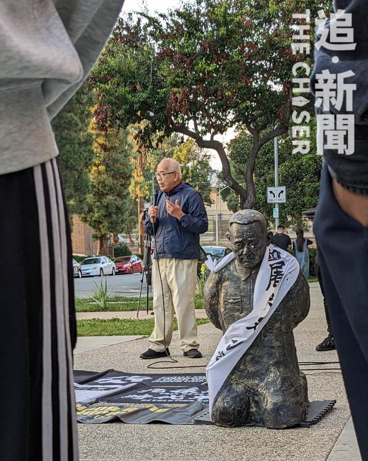 中國民主教育基金會、人道中國、美國香港人會館等團體則在加州洛杉磯舉行抗議活動,再次扮演「維尼帝」,又展示已故國家領導人鄧小平、李鵬的下跪雕像,拉出「中共解體才能停止逼害」的橫額抗議。