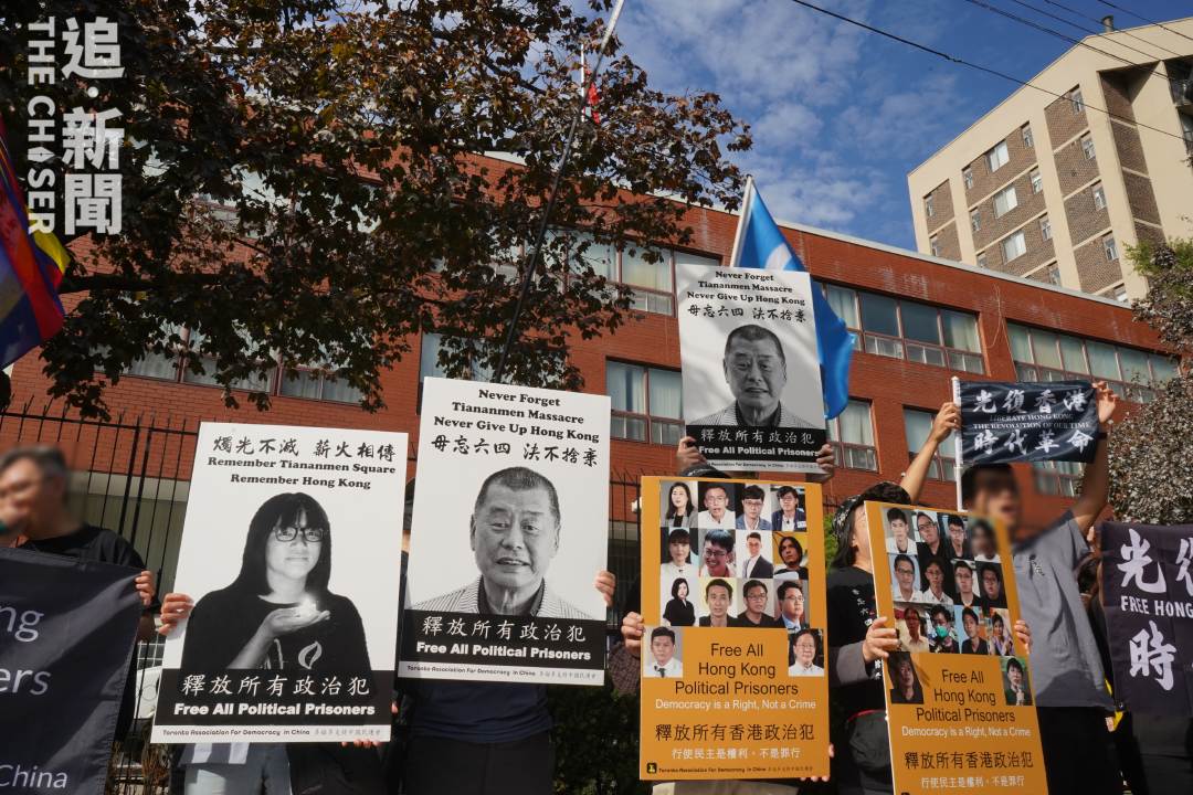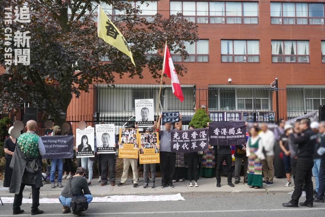 加拿大多倫多當地時間周日(1日)早上10時,多倫多支持中國民運會、多倫多中國民運會、以及西藏、新疆等組織,在多倫多中國領事館門外聯合舉行「全球㷫祝中華殘民共和國成立74周年」集會,現場約有200名來自各個民族參與者出席。《追新聞》特約記者在現場觀察,部份海外港人身穿黑衣、舉起光復旗,並展示「釋放李卓人」、「釋放鄒幸彤」等標語。有出席港人表示,10月1日是「國殤日」,4年前曾志健於荃灣中槍,希望出席活動提醒港人不要忘記事件。