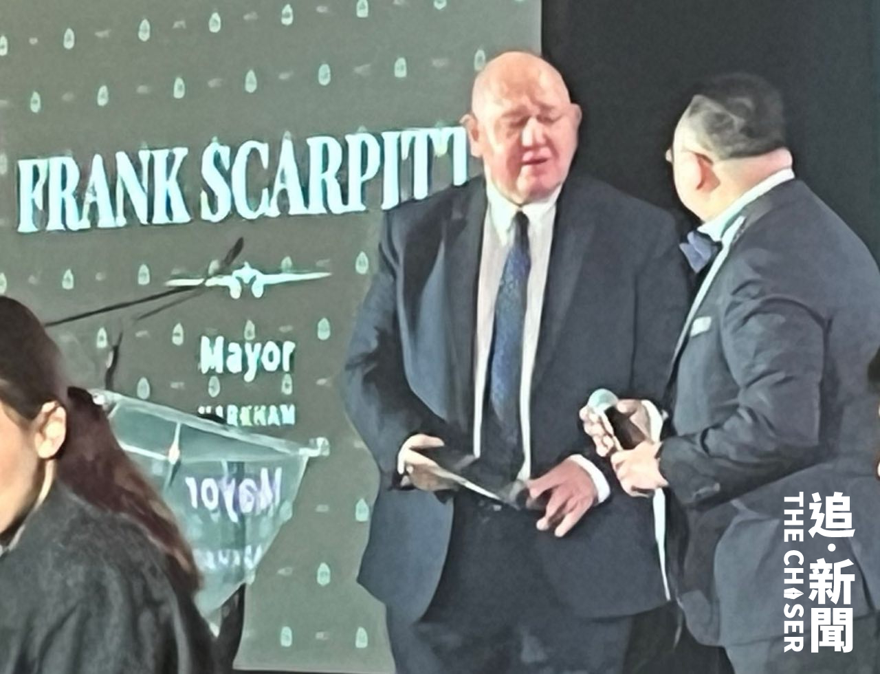 ▲萬錦市市長薛家平(Frank Scarpitti,左)親臨晚宴恭賀香港人商會成立。