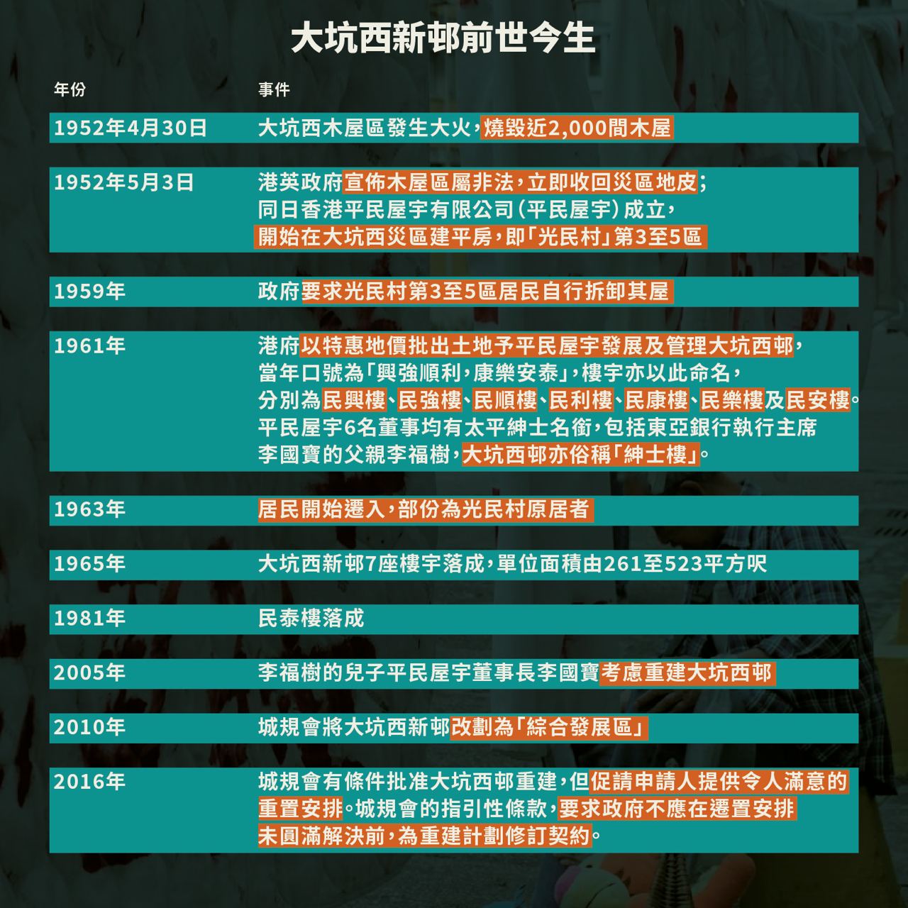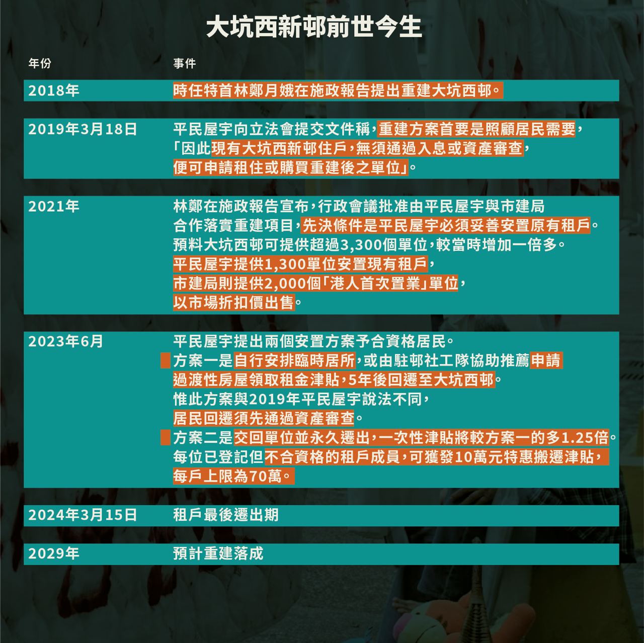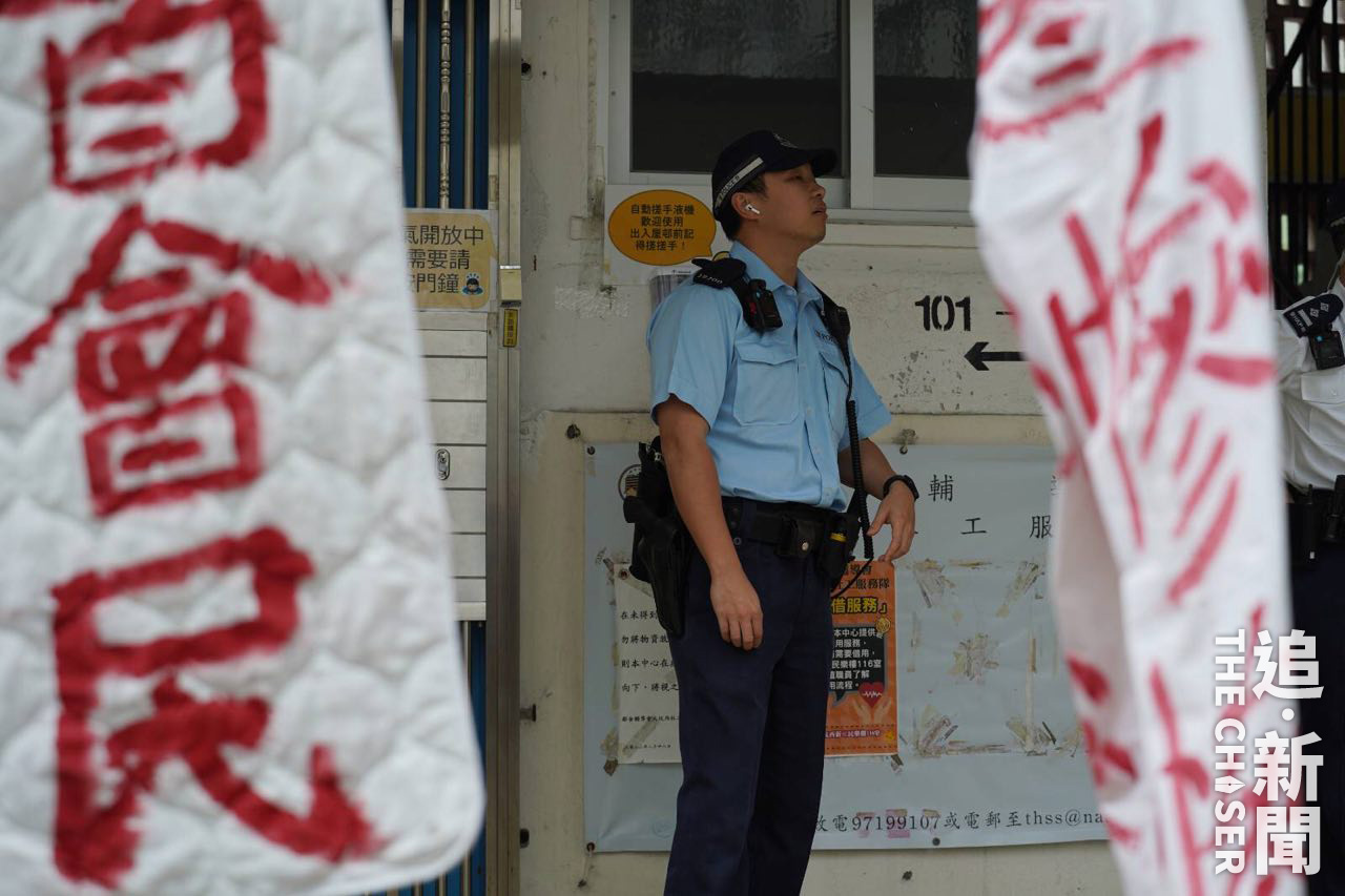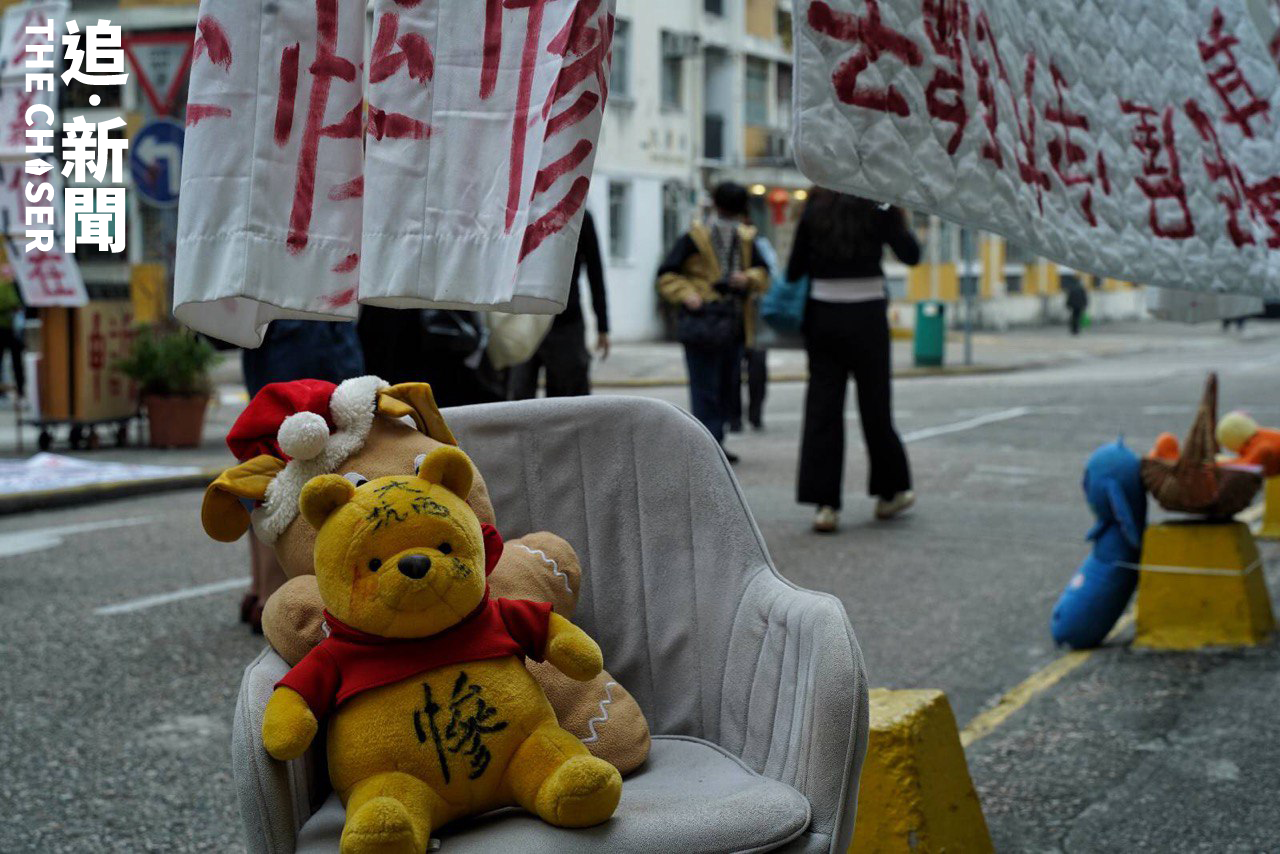香港最後一個私營廉租屋邨石硤尾大坑西邨重建在即,上周五(15日)為平民屋宇訂下居民遷出「死線」,仍有約20戶「留守」。留下來的人包括堅持抗爭的64歲郭基權、帶狗擺街站的67歲阿榮;亦有等候搬遷到過渡性房屋的80歲貞姐。「死線」前夕在區內舉行一人遊行控訴平民屋宇無良安置的郭基權,周六(16日)下午不時在邨內以螺絲批敲動鐵鑊及叫口號,並為70歲聾啞婆婆處境深感不忿。拒絕搬遷的居民吃蛋糕舉行慶祝會,聾啞婆婆憂心忡忡坐在一旁。阿榮則不斷與到場打卡人士講解最新情況。多名軍裝及便衣警員在場戒備,要求舉辦慶祝會居民出示身份證,並截查到場拍攝的年輕人,氣氛緊張與平日截然不同。