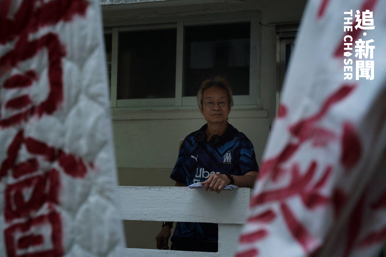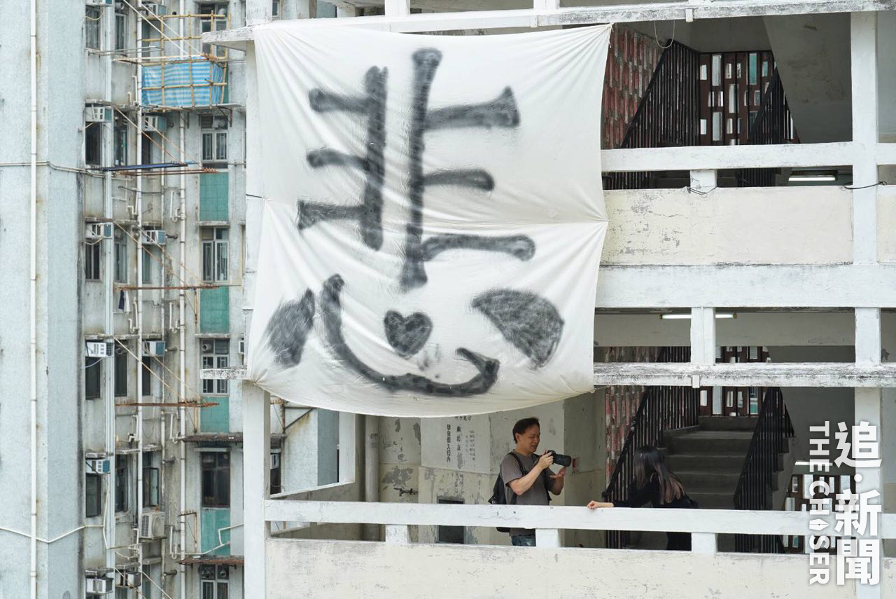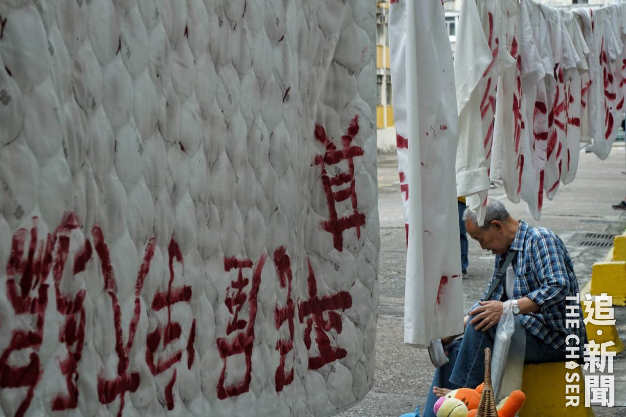 上星期,大坑西邨民樂樓地下晾有多件以紅油寫上「慘」字的白色衫,大廈走廊則掛起一塊約有一層樓高、以黑油寫上「悲」字的大白布。悲慘就是64歲拒遷居民郭基權(上圖左)的心聲,不少學生及攝影師到場拍照。「劫貧濟富,公義何在」,郭基權以螺絲批敲動鐵鑊,上周五(15日)居民遷出「死線」後繼續留守。「公義,尊嚴。實際條件我接受唔到,唔係以金錢衡量」。郭基權的外父1965年搬入大坑西邨,其後外父離世,太太繼承戶主身份,至2000年他才搬入。