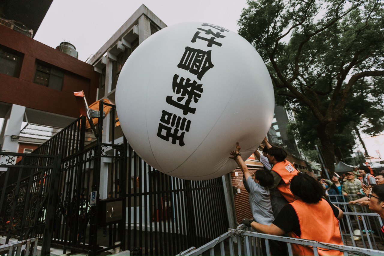 台灣野(國民黨、民眾黨)大朝(民進黨)小格局下,由藍白主導的立法院經過4日3夜激烈審議不理民間反對聲音,周二修訂通過立法院職權行使法部分條文。法案獲立院三讀過通後,立法院外抗議民眾把寫著「公民捍衛民主」、「重啟社會對話」的大型氣球,接力傳遞到立法院前,重申公民捍衞台灣民主訴求。