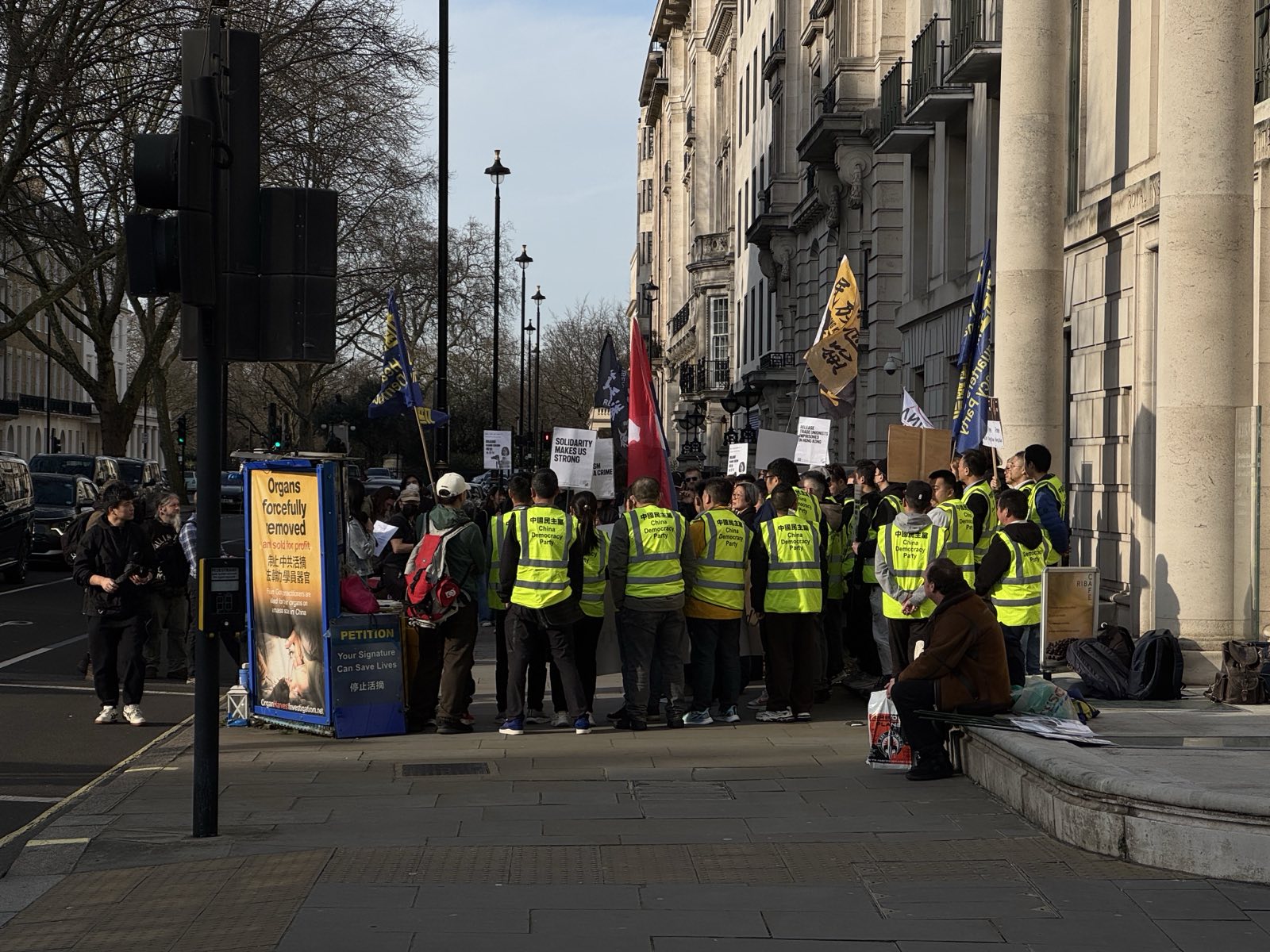 - ▲香港勞權監察聯同多個團體到倫敦中國大使館示威。(黃偉國提供)