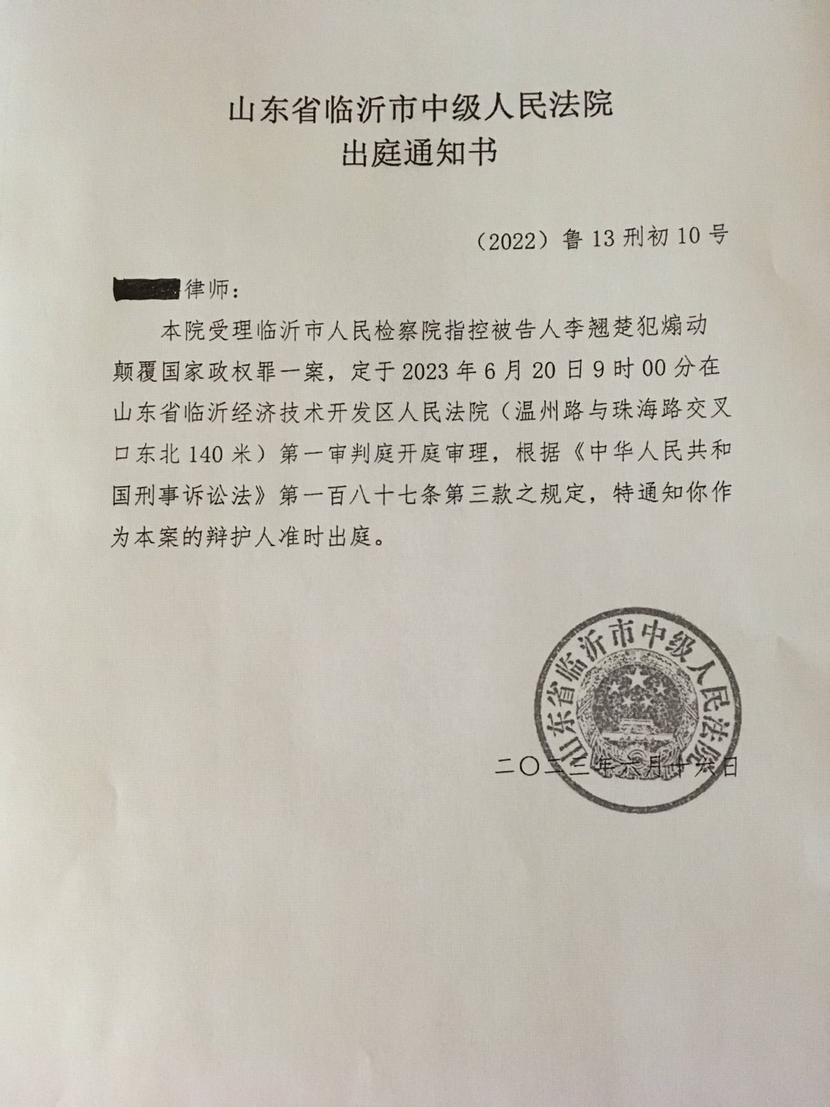 臨沂市檢察院在2022年2月28日出手,以「煽動顛覆國家政權罪」起訴李翹楚,移交至臨沂市中級法院,指控她與許志永有戀人關係,為其搭建個人博客,宣揚顛覆國家政權思想等,遂以此認定有煽動顛覆國家政權、推翻社會主義制度的意圖。
