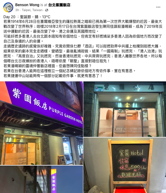 2024年,即將踏入反送中運動5年。2018年2月17日,當年只有20歲的陳同佳在台灣紫園飯店謀殺同齡的潘曉穎,造成一屍兩命,引發2019年《逃犯條例》修訂草案。香港文化研究及政治學學者黃偉國博士在周一(25日)聖誕節,專程到案發現場一遊,不禁問道:「若果潘曉穎的靈魂仲響飯店裏面,佢最想陳同佳點樣?」