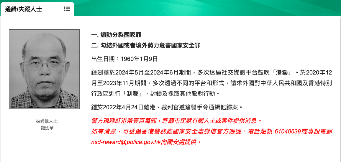港警國安處周二(24日)新增通緝6名海外港人,當中包括香港民意研究所前副行政總裁鍾劍華,他是港府通緝的19人名單之中,唯一一人沒有任何政黨背景或參與任何社運組織,是一直以學者身份評論時政的移英港人,他在《追新聞》專欄「鍾劍華時評」親自回應兩大指控,指從來沒有支持過「港獨」,2020年退休後也想過返中國居住,不諱言是切切實實的一名「大中華膠」。