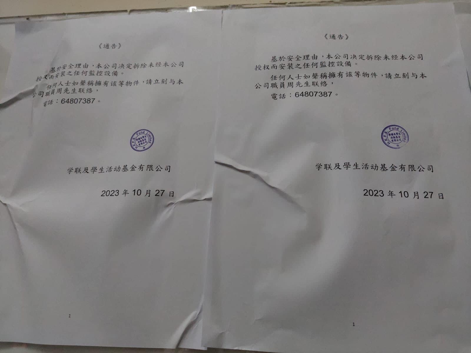 學聯周二(31日)於社交網站上載多張閉路電視截圖,可見有數名男子乘升降機前往學聯物業,單位門外的閉路電視亦被破壞。「學聯及學生活動基金有限公司」在門外貼出繁簡體夾雜的告示,聲稱基於「安全理由」拆除未經准許而安裝的監控設備。