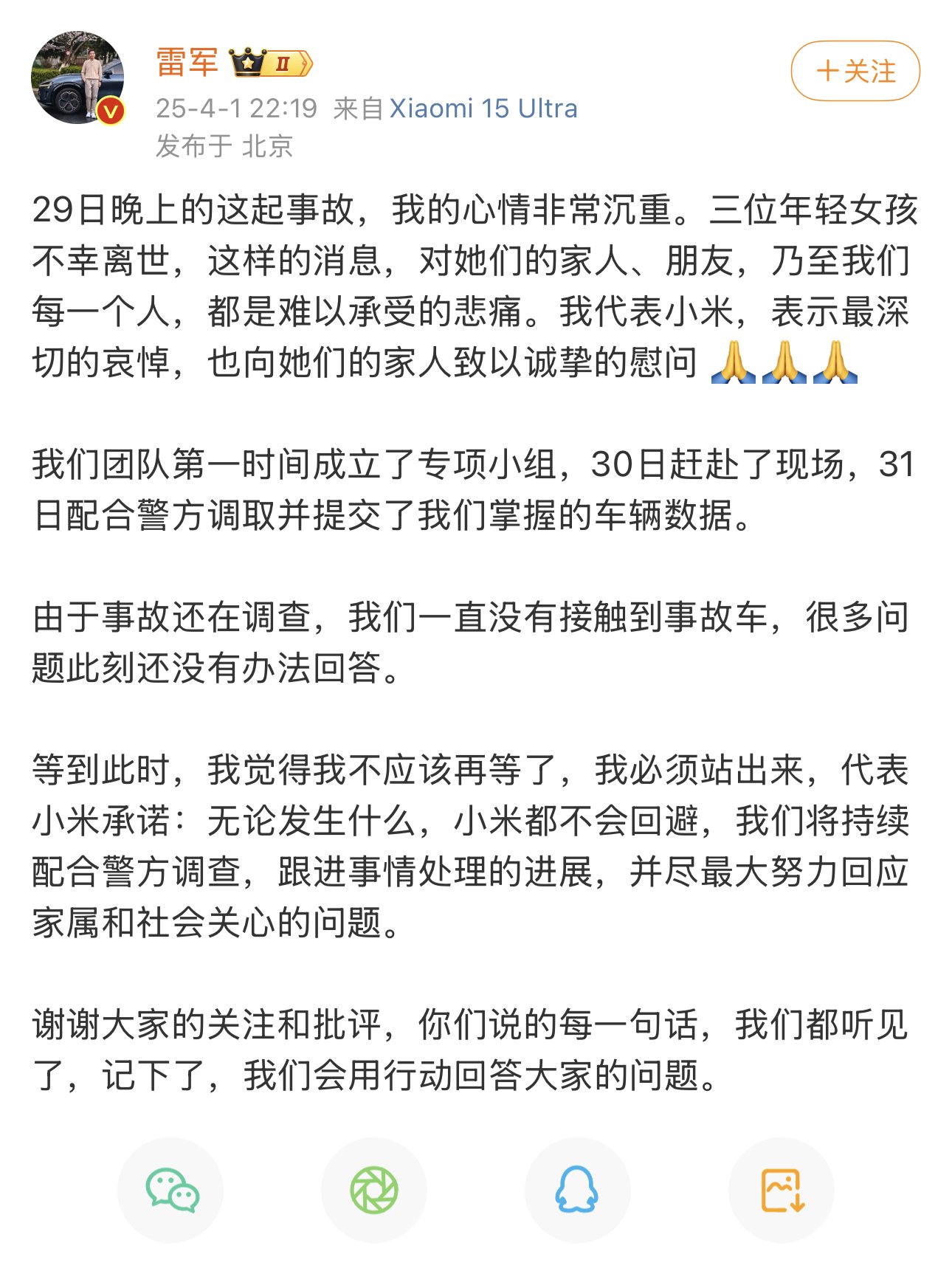 小米創辦人雷軍沉默了三天、於4月1日晚上10時許終於在微博回應,指「29日晚上的這起(宗)事故,我的心情非常沉重,我們團隊第一時間成立專項小組,事故還在調查中,我必須站出來,代表小米承諾:無論發生甚麼,小米都不會迴避。我代表小米表示最深切的哀悼,也向他們家人致以誠摯的慰問。」