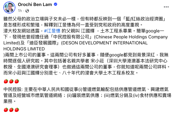 在Google搜索就找到江旻憓的父親江國輝曾擔任中民控股有限公司、迪臣發展國際的公司董事,中民控股主要在中國從事銷售及分銷天然氣及液化石油氣,以及經營供應彩票系統及設備。公開資料顯示,江國輝現年63歲,在英國錫菲大學(University of Sheffield)取得土木結構工程碩士學位,為香港工程學會成員,也是中國土木工程學會成員。同期擔任董事的還有宋小莊,也是江國輝的浸大校友。宋於2007至2008年擔任港府中央政策組非全職顧問,2016至2022年任中國港澳研究會理事,2010至2022年出任深圳大學港澳基本法研究中心全職教授,持有北京大學法學士、民法學碩士、憲法學及行政法學博士學位。有港媒2018年曾指宋與另外兩人北京航空航天大學副教授田飛龍、北京大學法學院教授饒戈平淪為中共打手的新一代中港專家。