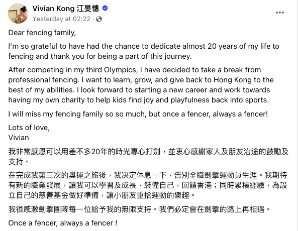 巴黎奧運女子個人重劍冠軍江旻憓周日(4日)突然在Instagram宣佈掛劍退役,結束全職擊劍運動員生涯,將會設立自己的慈善基金,周六(10日)將出席青年發展論壇,與民政及青年事務局副局長梁宏正,以及立法會議員霍啟剛等同場演講,題目為「培育青年正向思維 共創美好明天」。繼網民爆出江旻憓的碩士論文批評佔中運動「禍害極大,遺患深遠」引發熱議後,前區議員林兆彬周一(5日)翻查香港浸會大學校友網站發現江旻憓的父親名叫江國輝,土木工程系畢業,曾任中民控股有限公司、迪臣發展國際兩間上市公司的董事,而深圳大學港澳基本法研究中心教授、全國港澳研究會理事宋小莊曾與江一起擔任董事,而二人同是浸大校友。