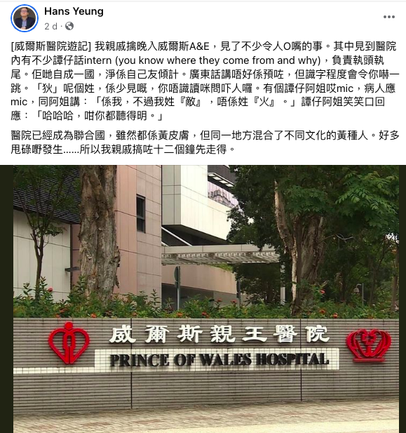 考評局前評核發展經理楊穎宇在Facebook分享經歷,他的親戚上周六(10日)到沙田威爾斯親王醫院急症室求診,見了不少令人「O嘴」的事。他發帖寫道親友的經歷:「見到醫院內有不少譚仔話intern (you know where they come from and why),負責執頭執尾。佢哋自成一國,淨係自己友傾計。廣東話講唔好係預咗,但識字程度會令你嚇一跳。『狄』呢個姓,係少見嘅,你唔識讀咪問吓人囉。」「譚仔阿姐嗌mic,病人應mic,同阿姐講:『係我,不過我姓『敵』,唔係姓『火』。譚仔阿姐笑笑口回應:『哈哈哈,咁你都聽得明。』」
