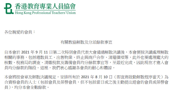 教協2021年宣佈解散,並透露將沽售持有的物業,把餘款平分予全體會員。教協周四(9日)去信會員,表示扣除遣散費等開支後,每名合資格會員可獲分發3,190元,最遲12月登記領取,其後便會依例正式登記解散,形容是教協50年歷史的最後一項會務。有屬教協會員的現職教師向《追新聞》稱,教協分發餘款標誌「成件事真係劃上一個句號」,她會選擇領取款項,以免萬一出現變故,資金可能被政府凍結,但認為教協角色始終難以取代。