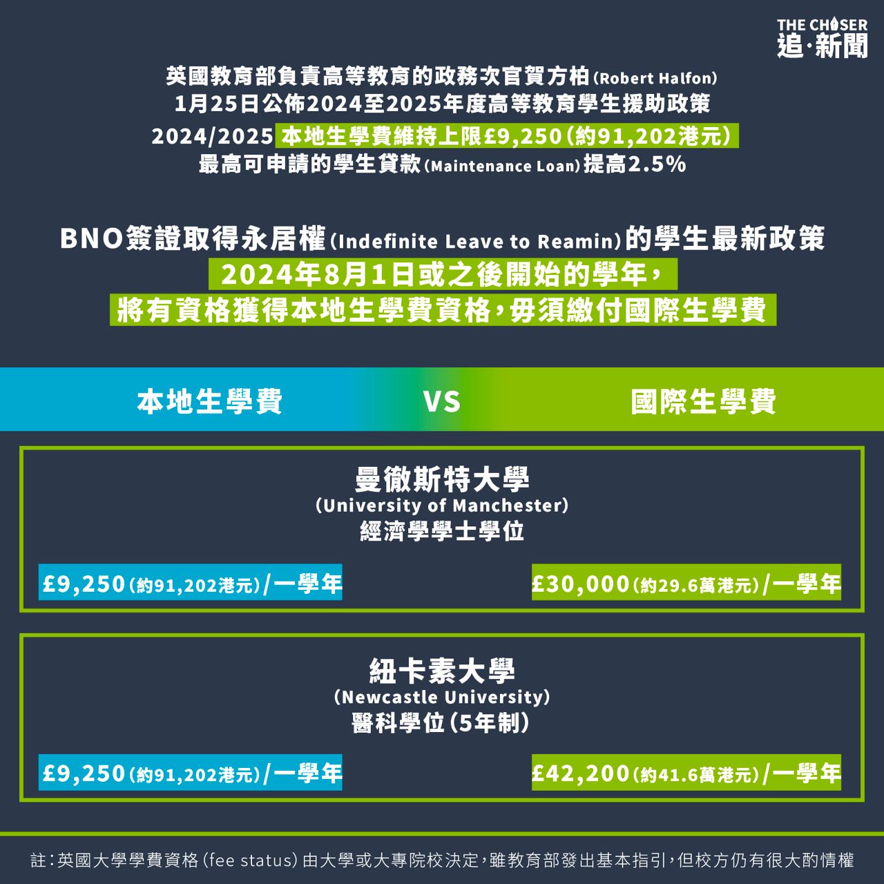 因為未能負擔高昂的國際生學費選擇休學的Chloe,她向《追新聞》記者表示,打算休學直至可以用本地生學費入大學為止。Chloe在2023年6月應考英國高級程度會考(A-level),試前已獲約克大學(University of York)、曼徹斯特大學(University of Manchester),以及倫敦國王學院(King’s College London)的哲學、政治及經濟科(PPE)發出有條件取錄(conditional offer),不過跟家人商量後明白未能負擔6萬至10萬鎊的國際生學費,決定先投身社會。