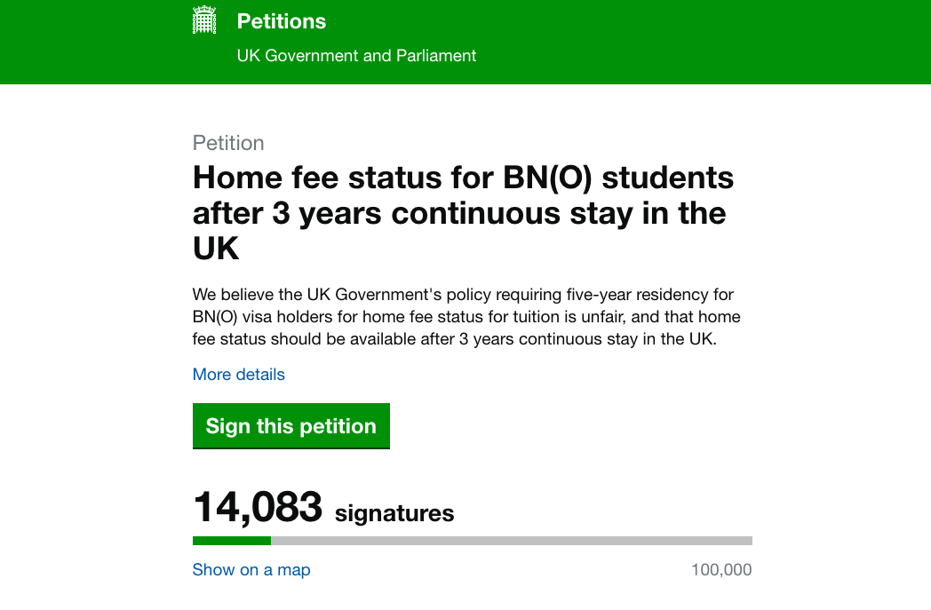 爭取居英3年BN(O)簽證持有人獲大學本地生學費資格聯署連結: