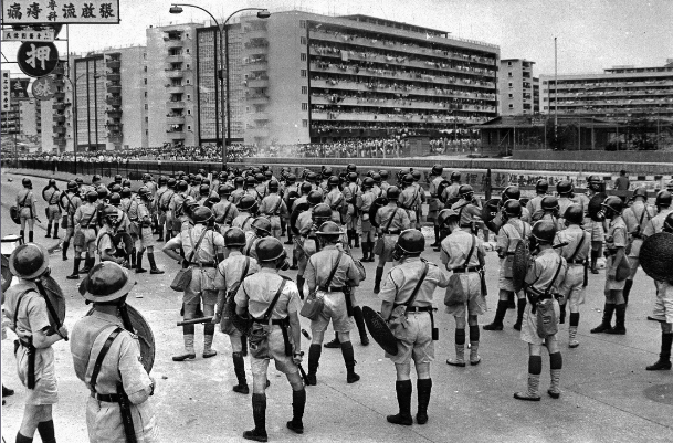 「這張相是在新蒲崗東頭邨拍攝的,當時在警察背後角度不怎麼樣。我跟《星島日報》陳輝兩人走到離警察很遠的位置想拍好照片。結果撤退時被圍住打了一身。搶光了菲林和手錶,一人一拳的打,打得我幾乎想喊救命。幸好有個穿白衣的年輕人,可能是職員,從銀行出來救了我。」