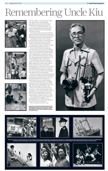 陳橋先生辭世(1927-2024),《南華早報》舊日同袍,攝影記者及新聞界老朋友們組織起來遙送花圈道別。評論人、攝影記者、《消失的檔案》團隊致送的花圈,上款為「深切悼念香港新聞攝影界泰斗陳橋先生」。於《南華早報》供職28年,拍下了四萬卷菲林,以技術超群、勇敢敏銳令港人懷念的橋叔,為香港歷史各個重要時刻留下了重要的影像記錄,例如大逃港、六七暴動、天災肆虐影像,也通過照片記錄了從六十年代一路走來的香港社會百態。陳橋新聞圖片集《鏡頭下的歷史》(2006年溫哥華中僑互助會出版),選刊了280幀 圖片,為歷史留下永恆的印記。