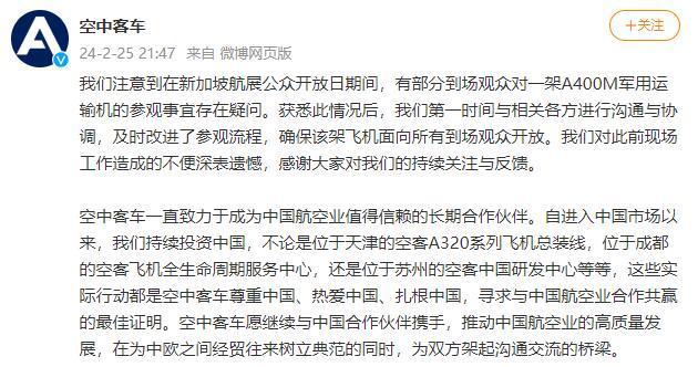 空巴透過官方微博周日(25日)晚上9時許發帖回應:「獲悉此情況後,我們第一時間與相關各方進行溝通與協調,及時改進了參觀流程,確保該架飛機面向所有到場觀眾開放……空中客車尊重中國、熱愛中國、紮根中國……願繼續與中國合作夥伴攜手,推動中國航空業的高質量發展,在為中歐之間經貿往來樹立典範的同時,為雙方架起溝通交流的橋樑。」