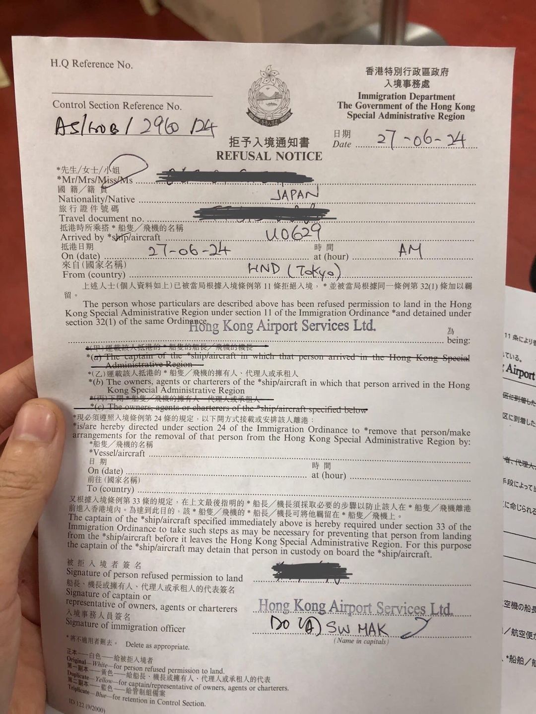 平野雨龍的帖文附上入境處的「拒絕入境通知書」,文件中顯示她由東京飛抵香港,遭香港入境處以《入境條例》第11條拒絕入境,但沒提及具體理由。她在帖文中透露,赴港目的是為了在7月1日去銅鑼灣。因為去年沒有人到現場悼念「七一刺警案」自戕者梁健輝,「所以今年我真的很想去。我想見梁健輝。雖然已經過去了三年,我依然強烈地在想念。」
