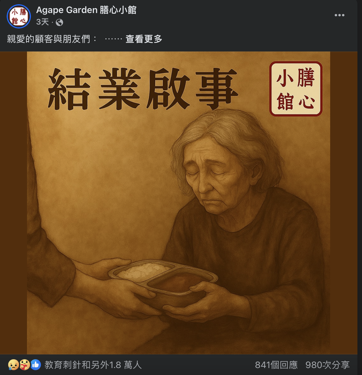 另一方面,在社區向長者派發免費飯盒亦曾和「餵貓婆婆」為流浪貓奔走的膳心小館日前在社媒發帖,指因房屋署收回舖位,石硤尾分店下月上旬結業。館方之後發帖,指因分店下月關門,逾50隻街貓將頓失「糧倉」,恐失支援。