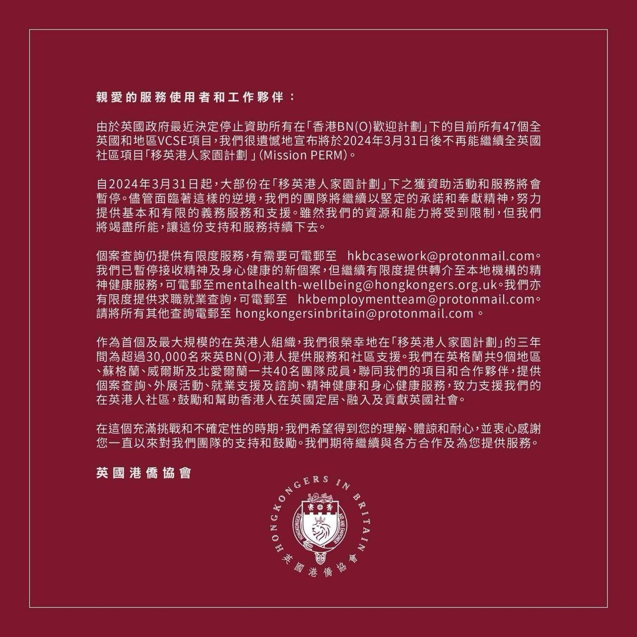 英國港僑協會周五(15日)發聲明證實,英國政府停止資助所在「香港BN(O)歡迎計劃」的47個全國及地區VCSE項目,該會本月31日後不再提供「移英港人家園計劃」(Mission PERM)社區項目。