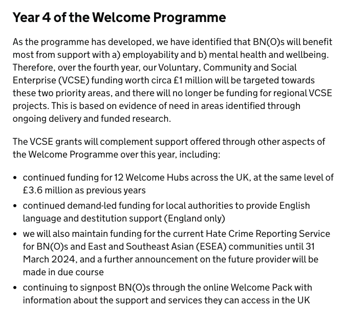 .繼續向12間全英國「香港移民歡迎中心」(Welcome Hubs)撥款360萬鎊,與去年相若;