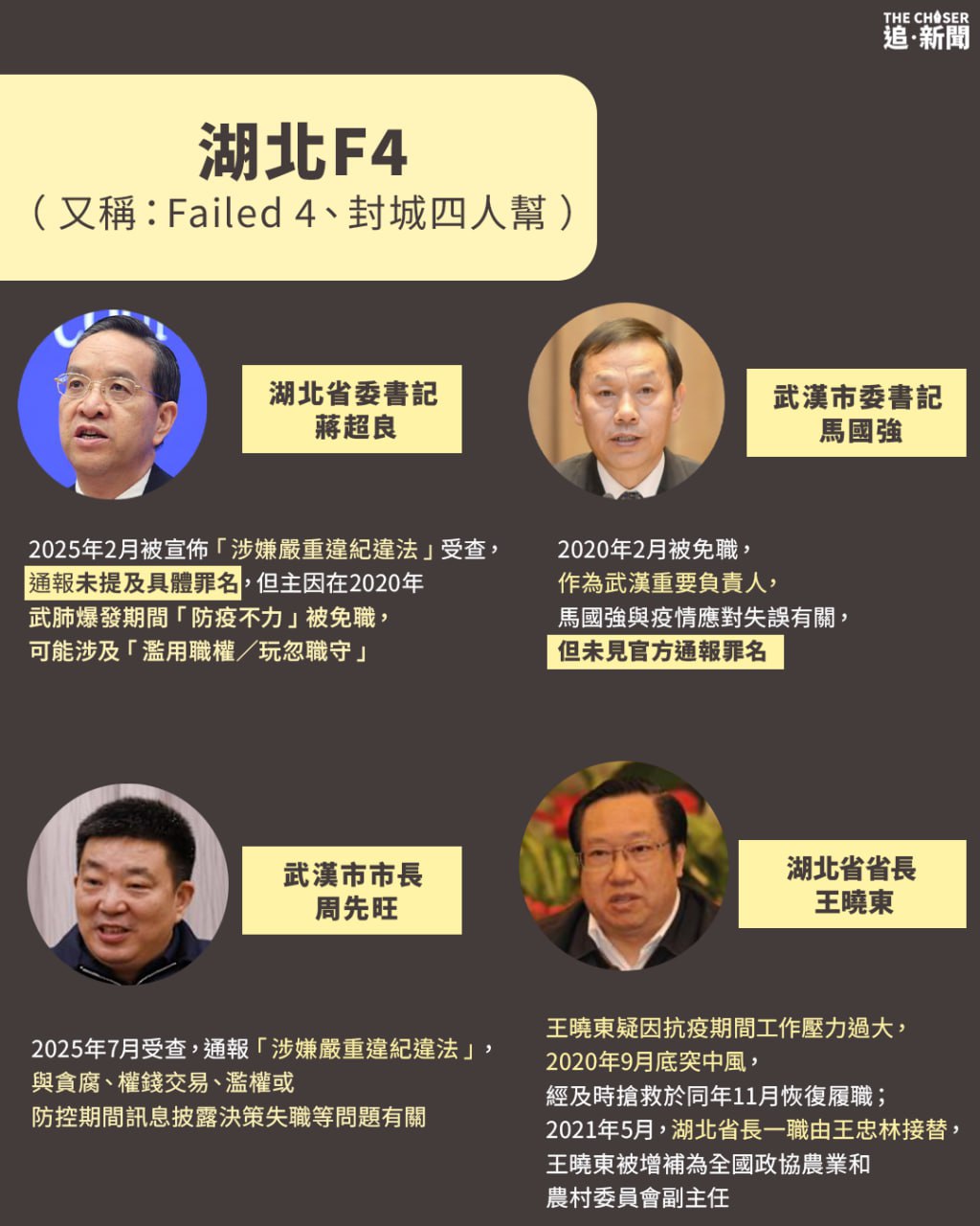 武漢肺炎在2019年12月開始在中國爆發,武漢當局在封城前的1月初還對外宣稱疫情「可防可控」、「未見人傳人證據」,江漢區更舉辦「萬家宴」導致疫情迅速擴散。北京政府自中共二十大以來,陸續清洗當年的決策官員,繼湖北前書記蔣超良、武漢市委書記馬國強於2020年2月被免職後,武漢「封城」市長周先旺於2021年1月調任湖北省政協副主席退居幕後,淡化外界對疫情的討論與究責。直至今年7月8日,中共中紀委才通報周先旺「涉嫌嚴重違紀違法」被查,據報住家被抄,數名家人一併帶走。財新網翻查公開訊息顯示,周先旺在落馬前的5月17日,曾前往湖北十堰竹溪縣調研鄉村振興等工作。