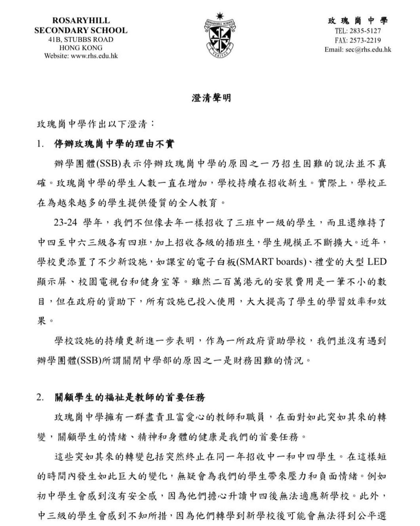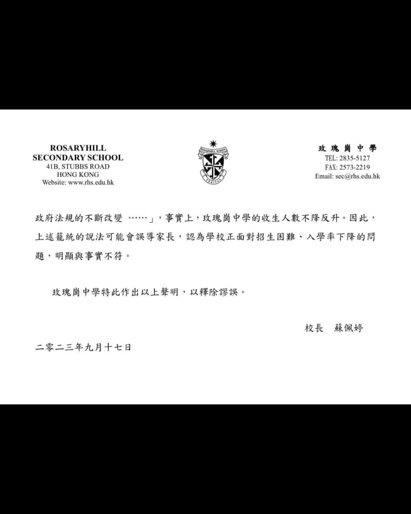 蘇校長的聲明在校網迅速下架後,玫瑰崗學校的辦學團體道明會校監何幼孫隨即發聲明「澄清」,指小學收生人數比2019年大跌65%,對辦學團體構成財政壓力;而中學部人數由高峯期逾2,000人減至400人,即使有多間津校關閉,但近兩年收生人數比2019年仍持續下降6%,為了保護玫瑰山遺產,必須採取積極措施,而不是待到為時已晚的時候。