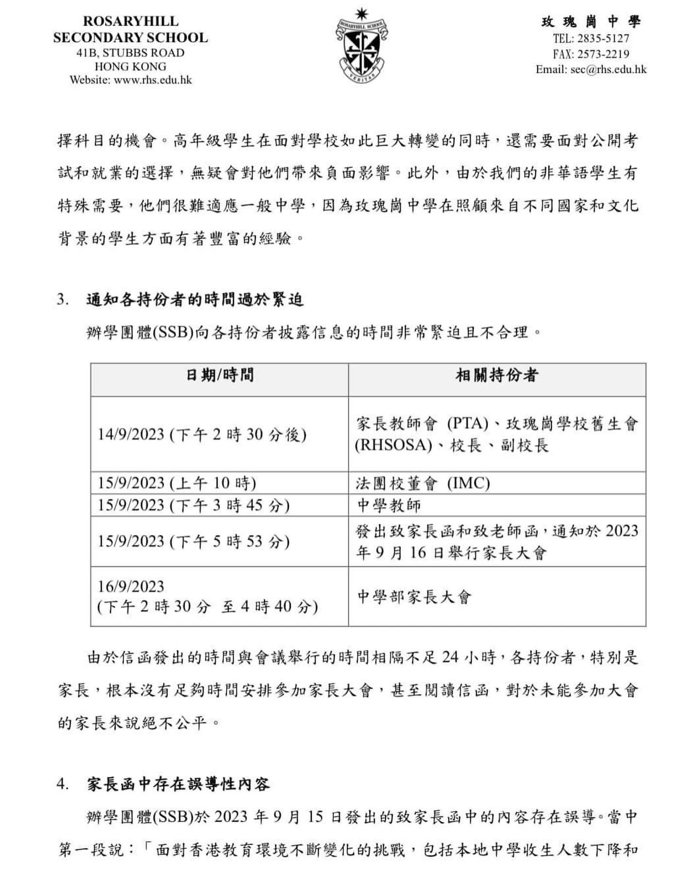 對照香港道爾頓學校於上周五(15日)發出新聞稿的時間,蘇校長聲明中揭露道明會於前一日(14日)才向各持份者,包括家教會、舊生會、校長、副校長披露訊息的時間非常緊逼且不合理。在米已成炊下,於15日向家長和教師發函通知於16日舉行「中學部家長大會」,相隔不足24小時。家長函內容也存在誤導,蘇校長透露,函中第一段寫道:「面對香港教育環境不斷變化的挑戰,包括本地中學收生人數下降和政府法規的不斷改變……」事實上,玫瑰崗中學收生人數不降反升,入學率下降問題明顯與事實不符。