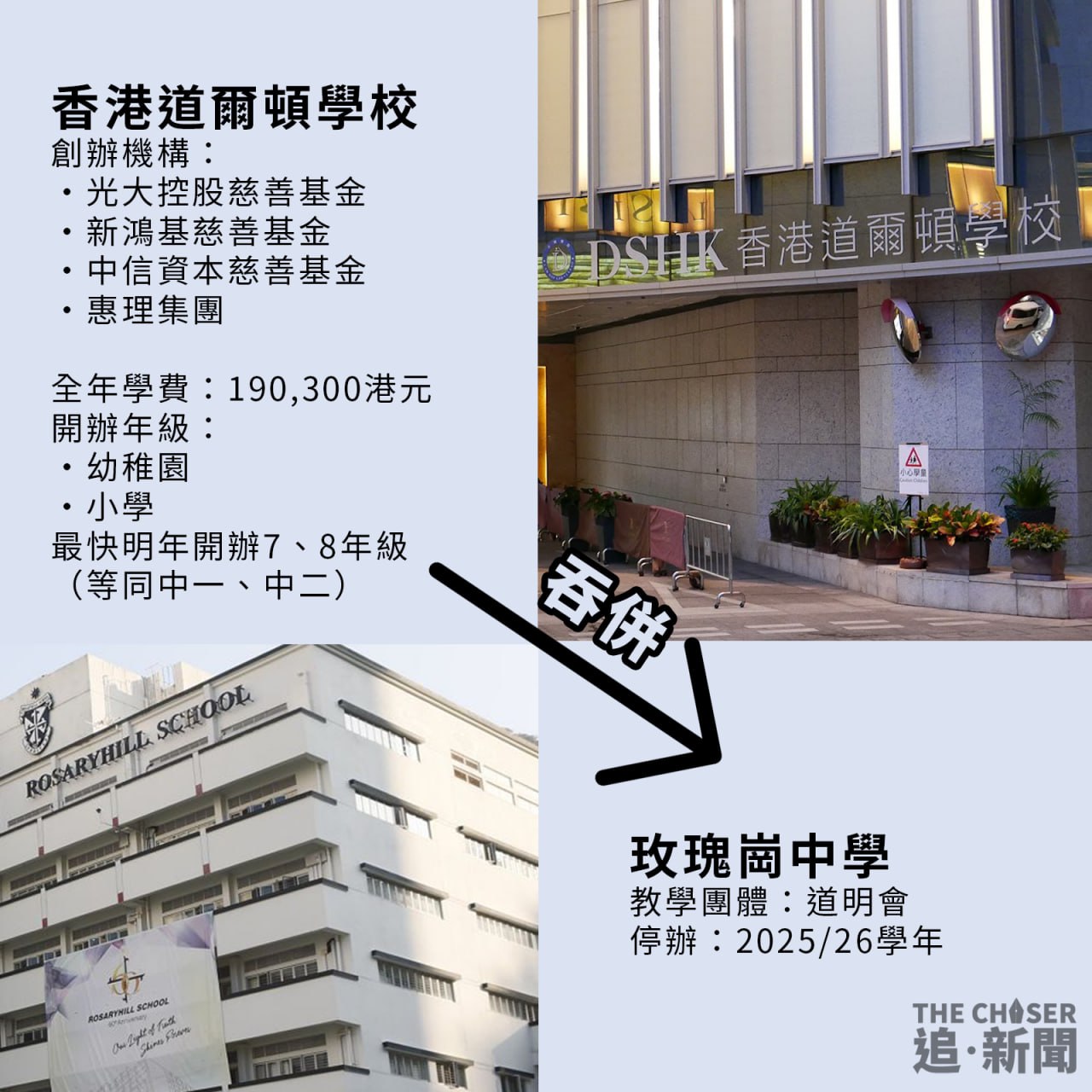 香港道爾頓學校15日發出新聞稿,與玫瑰崗學校的辦學團體道明會聯合宣佈,香港道爾頓學校將於2024/25學年接辦玫瑰崗幼稚園和玫瑰崗學校,與道爾頓學校幼稚園和小學合併,玫瑰崗中學現有學生將按原有機制就讀至2025/26學年,直至以政府資助模式完成高中課程,隨後香港道爾頓學校會把國際班擴展至中學。