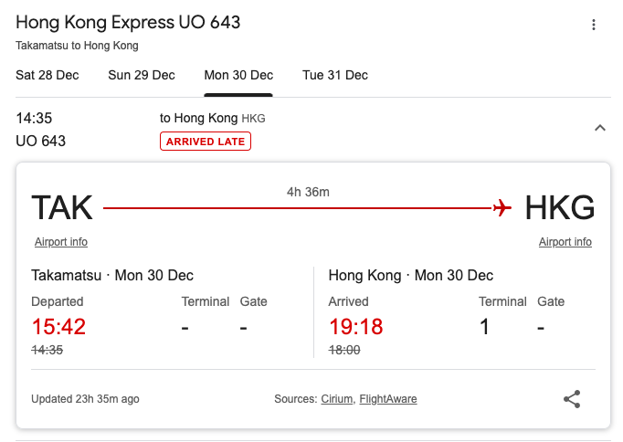 《追新聞》翻查12月30日香港快運UO643航班,原定下午2時35分由高松起飛延誤至下午3時42分起飛,在香港機場降落亦延誤了1小時18分、直至晚上7時18分才抵港。網民指,一個穿粉紅色系的三人家庭拖着超大行李箱,兩母女額頭貼着退熱貼,明顯病樣,聽到日本地勤指她們「slightly fever(輕微發燒)」。男乘客用港式英語回應指這幾天病發,因為「浸得溫泉太多」,還嫌乘務長與地勤職員溝通得太慢,用廣東話發晦氣說:「咁都話唔到事。」
