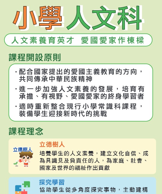 教育局在文件開宗明義,指出開設人文科的首個原則為「配合愛國主義教育的方向」,並提到中國全國人大常委會10月通過的《愛國主義教育法》,其後才是加強人文素養發展和整合現行常識科課程。局方形容人文科目標是促進關愛、共融、熱愛大自然等人文素養,「這與國家提倡的人類命運共同體理念相呼應」。