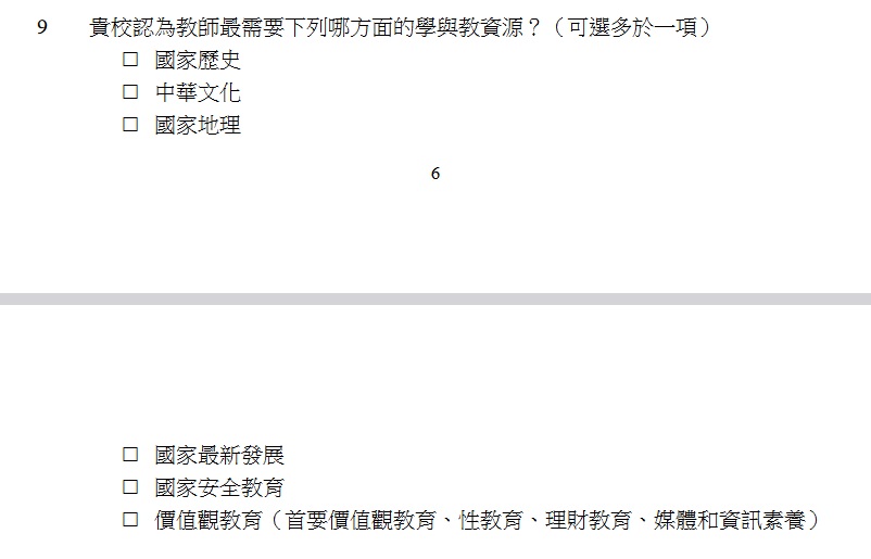 教育局亦「蒐集」學校對人文科課程框架的意見,要求每間學校「表達」他們是否認同落實愛國主義教育的發展方向,並詢問學校教師需要哪方面的學與教資源,6個選項分別為「國家歷史」、「中華文化」、「國家地理」、「國家最新發展」、「國家安全教育」和「價值觀教育」,即5項與國情教育相關。