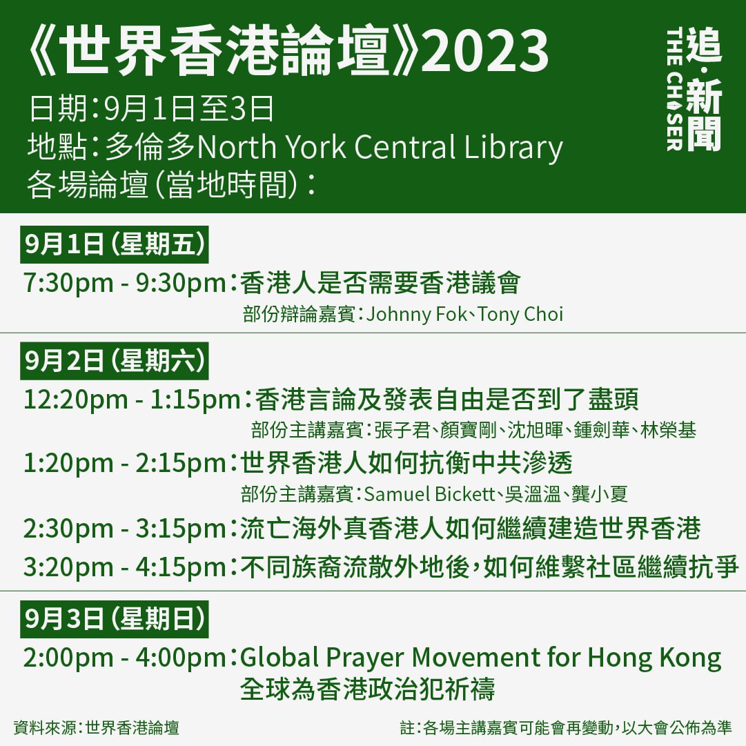 今年「世界香港論壇」將於9月1至3日在多倫多舉行,大部份活動會在North York Central Library進行。論壇由資深對沖基金經理錢志健牽頭,邀請了流散世界各地的海外港人擔任演講嘉賓,除了許智峯、鄭文傑、王丹、沈旭暉外,還包括商台前主持張子君、學者鍾劍華、中國學者龔小夏、前有線財經台台長顏寶剛、前《蘋果日報》專欄作家利世民、香港自由委員會基金會(CFHK)主席祈福德(Mark Clifford)、前銅鑼灣書店店長林榮基、美籍律師Samuel Bickett,以及國殤之柱創作者與丹麥雕塑家高志活(Jens Galschiøt),仍在香港的甘浩望神父、前全國政協委員劉夢熊等人。